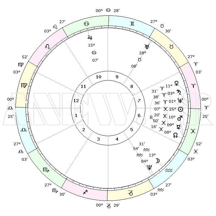 | | ΘΕΣΕΙΣ ΠΛΑΝΗΤΩΝ ΑΣΤΡΟΛΟΓΙΚΟΥ ΧΑΡΤΗ ΤΗΣ ΣΤΙΓΜΗΣ ΑΥΤΗΣ | | | | Πλανήτης | Ζώδιο | Μοίρες | Δεκαήμ. | Σε οίκο | Απόκλιση | | Ακμές των οίκων | | Ηλιος | Ιχθείς | 25°04' | Τρίτο | 7 | 01 S 58 | | 1ος | 12°38' | Παρθένος | | Σελήνη | Υδροχόος | 12°44' | Δεύτερο | 5 | 19 S 13 | | 2ος | 07°46' | Ζυγός | | Ερμής | Ιχθείς | 09°52'R | Πρώτο | 6 | 05 S 46 | | 3ος | 07°23' | Σκορπιός | | Αφροδίτη | Κριός | 11°26' | Δεύτερο | 8 | 03 N 35 | | 4ος | 10°19' | Τοξότης | | Αρης | Ιχθείς | 10°17' | Δεύτερο | 6 | 08 S 43 | | 5ος | 13°47' | Αιγόκερως | | Δίας | Καρκίνος | 15°07' | Δεύτερο | 11 | 22 N 56 | | 6ος | 14°57' | Υδροχόος | | Κρόνος | Κριός | 03°37' | Πρώτο | 7 | 00 S 31 | | 7ος | 12°38' | Ιχθείς | | Ουρανός | Ταύρος | 28°08' | Τρίτο | 9 | 19 N 34 | | 8ος | 07°46' | Κριός | | Ποσειδώνας | Κριός | 01°35' | Πρώτο | 7 | 00 S 34 | | 9ος | 07°23' | Ταύρος | | Πλούτωνας | Υδροχόος | 04°54' | Πρώτο | 5 | 22 S 49 | | 10ος | 10°20' | Δίδυμοι | | Β. Δεσμός | Ιχθείς | 08°16' | Πρώτο | 6 | 08 S 28 | | 11ος | 13°47' | Καρκίνος | | Ωροσκόπος | Παρθένος | 12°38' | Δεύτερο | | | 12ος | 14°57' | Λέων | | Μεσουράνημα | Δίδυμοι | 10°20' | Δεύτερο | | | |
