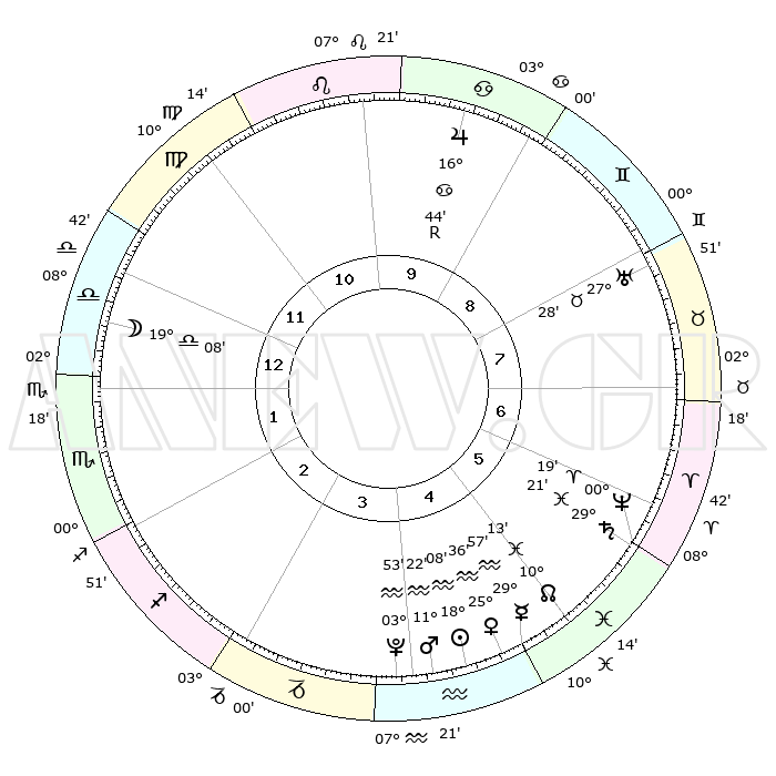| | ΘΕΣΕΙΣ ΠΛΑΝΗΤΩΝ ΑΣΤΡΟΛΟΓΙΚΟΥ ΧΑΡΤΗ ΤΗΣ ΣΤΙΓΜΗΣ ΑΥΤΗΣ | | | | Πλανήτης | Ζώδιο | Μοίρες | Δεκαήμ. | Σε οίκο | Απόκλιση | | Ακμές των οίκων | | Ηλιος | Υδροχόος | 18°04' | Δεύτερο | 4 | 15 S 25 | | 1ος | 14°02' | Ζυγός | | Σελήνη | Ζυγός | 18°22' | Δεύτερο | 1 | 10 S 16 | | 2ος | 11°32' | Σκορπιός | | Ερμής | Υδροχόος | 29°50' | Τρίτο | 5 | 12 S 47 | | 3ος | 12°32' | Τοξότης | | Αφροδίτη | Υδροχόος | 25°32' | Τρίτο | 5 | 14 S 21 | | 4ος | 15°51' | Αιγόκερως | | Αρης | Υδροχόος | 11°19' | Δεύτερο | 4 | 18 S 24 | | 5ος | 18°47' | Υδροχόος | | Δίας | Καρκίνος | 16°44'R | Δεύτερο | 10 | 22 N 42 | | 6ος | 18°36' | Ιχθείς | | Κρόνος | Ιχθείς | 29°21' | Τρίτο | 6 | 02 S 15 | | 7ος | 14°02' | Κριός | | Ουρανός | Ταύρος | 27°28' | Τρίτο | 8 | 19 N 24 | | 8ος | 11°32' | Ταύρος | | Ποσειδώνας | Κριός | 00°19' | Πρώτο | 6 | 01 S 05 | | 9ος | 12°32' | Δίδυμοι | | Πλούτωνας | Υδροχόος | 03°53' | Πρώτο | 4 | 22 S 59 | | 10ος | 15°51' | Καρκίνος | | Β. Δεσμός | Ιχθείς | 10°13' | Δεύτερο | 5 | 07 S 44 | | 11ος | 18°47' | Λέων | | Ωροσκόπος | Ζυγός | 14°02' | Δεύτερο | | | 12ος | 18°36' | Παρθένος | | Μεσουράνημα | Καρκίνος | 15°51' | Δεύτερο | | | |