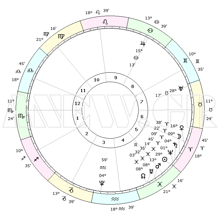 | | ΘΕΣΕΙΣ ΠΛΑΝΗΤΩΝ ΑΣΤΡΟΛΟΓΙΚΟΥ ΧΑΡΤΗ ΤΗΣ ΣΤΙΓΜΗΣ ΑΥΤΗΣ | | | | Πλανήτης | Ζώδιο | Μοίρες | Δεκαήμ. | Σε οίκο | Απόκλιση | | Ακμές των οίκων | | Ηλιος | Ιχθείς | 29°10' | Τρίτο | 6 | 00 S 20 | | 1ος | 21°12' | Ζυγός | | Σελήνη | Κριός | 08°23' | Πρώτο | 6 | 05 N 42 | | 2ος | 19°07' | Σκορπιός | | Ερμής | Ιχθείς | 08°33'R | Πρώτο | 5 | 07 S 13 | | 3ος | 20°28' | Τοξότης | | Αφροδίτη | Κριός | 16°32' | Δεύτερο | 6 | 05 N 40 | | 4ος | 24°08' | Αιγόκερως | | Αρης | Ιχθείς | 13°32' | Δεύτερο | 5 | 07 S 28 | | 5ος | 27°05' | Υδροχόος | | Δίας | Καρκίνος | 15°12' | Δεύτερο | 9 | 22 N 56 | | 6ος | 26°27' | Ιχθείς | | Κρόνος | Κριός | 04°08' | Πρώτο | 6 | 00 S 18 | | 7ος | 21°12' | Κριός | | Ουρανός | Ταύρος | 28°17' | Τρίτο | 8 | 19 N 36 | | 8ος | 19°07' | Ταύρος | | Ποσειδώνας | Κριός | 01°45' | Πρώτο | 6 | 00 S 30 | | 9ος | 20°28' | Δίδυμοι | | Πλούτωνας | Υδροχόος | 04°59' | Πρώτο | 4 | 22 S 49 | | 10ος | 24°08' | Καρκίνος | | Β. Δεσμός | Ιχθείς | 08°03' | Πρώτο | 5 | 08 S 33 | | 11ος | 27°05' | Λέων | | Ωροσκόπος | Ζυγός | 21°12' | Τρίτο | | | 12ος | 26°27' | Παρθένος | | Μεσουράνημα | Καρκίνος | 24°08' | Τρίτο | | | |