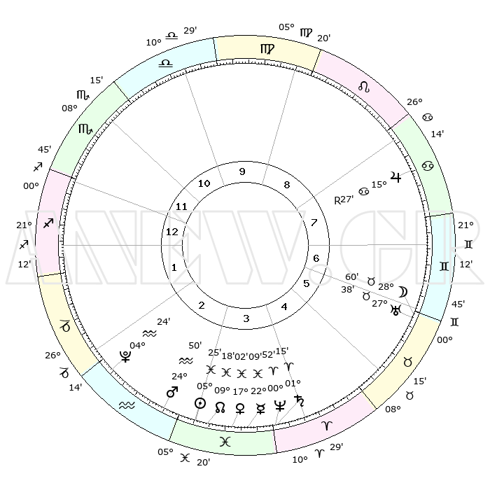 | | ΘΕΣΕΙΣ ΠΛΑΝΗΤΩΝ ΑΣΤΡΟΛΟΓΙΚΟΥ ΧΑΡΤΗ ΤΗΣ ΣΤΙΓΜΗΣ ΑΥΤΗΣ | | | | Πλανήτης | Ζώδιο | Μοίρες | Δεκαήμ. | Σε οίκο | Απόκλιση | | Ακμές των οίκων | | Ηλιος | Ιχθείς | 05°21' | Πρώτο | 3 | 09 S 33 | | 1ος | 02°07' | Τοξότης | | Σελήνη | Ταύρος | 28°06' | Τρίτο | 6 | 24 N 47 | | 2ος | 03°32' | Αιγόκερως | | Ερμής | Ιχθείς | 22°08' | Τρίτο | 4 | 01 S 03 | | 3ος | 09°36' | Υδροχόος | | Αφροδίτη | Ιχθείς | 16°57' | Δεύτερο | 4 | 06 S 28 | | 4ος | 15°41' | Ιχθείς | | Αρης | Υδροχόος | 24°47' | Τρίτο | 3 | 14 S 17 | | 5ος | 16°27' | Κριός | | Δίας | Καρκίνος | 15°28'R | Δεύτερο | 8 | 22 N 52 | | 6ος | 11°12' | Ταύρος | | Κρόνος | Κριός | 01°15' | Πρώτο | 4 | 01 S 28 | | 7ος | 02°07' | Δίδυμοι | | Ουρανός | Ταύρος | 27°38' | Τρίτο | 6 | 19 N 27 | | 8ος | 03°32' | Καρκίνος | | Ποσειδώνας | Κριός | 00°52' | Πρώτο | 4 | 00 S 51 | | 9ος | 09°36' | Λέων | | Πλούτωνας | Υδροχόος | 04°24' | Πρώτο | 2 | 22 S 54 | | 10ος | 15°41' | Παρθένος | | Β. Δεσμός | Ιχθείς | 09°19' | Πρώτο | 3 | 08 S 05 | | 11ος | 16°27' | Ζυγός | | Ωροσκόπος | Τοξότης | 02°07' | Πρώτο | | | 12ος | 11°12' | Σκορπιός | | Μεσουράνημα | Παρθένος | 15°41' | Δεύτερο | | | |