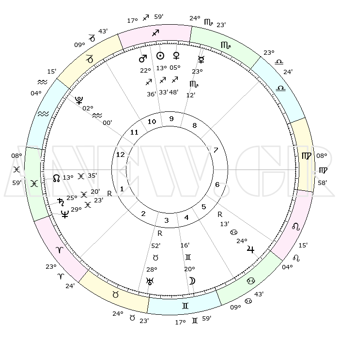 | | ΘΕΣΕΙΣ ΠΛΑΝΗΤΩΝ ΑΣΤΡΟΛΟΓΙΚΟΥ ΧΑΡΤΗ ΤΗΣ ΣΤΙΓΜΗΣ ΑΥΤΗΣ | | | | Πλανήτης | Ζώδιο | Μοίρες | Δεκαήμ. | Σε οίκο | Απόκλιση | | Ακμές των οίκων | | Ηλιος | Τοξότης | 13°31' | Δεύτερο | 10 | 22 S 25 | | 1ος | 23°33' | Υδροχόος | | Σελήνη | Δίδυμοι | 19°50' | Δεύτερο | 4 | 28 N 00 | | 2ος | 09°19' | Κριός | | Ερμής | Σκορπιός | 23°11' | Τρίτο | 9 | 16 S 08 | | 3ος | 13°19' | Ταύρος | | Αφροδίτη | Τοξότης | 05°46' | Πρώτο | 9 | 20 S 44 | | 4ος | 08°24' | Δίδυμοι | | Αρης | Τοξότης | 22°35' | Τρίτο | 10 | 23 S 55 | | 5ος | 00°09' | Καρκίνος | | Δίας | Καρκίνος | 24°13'R | Τρίτο | 6 | 21 N 26 | | 6ος | 23°06' | Καρκίνος | | Κρόνος | Ιχθείς | 25°20' | Τρίτο | 1 | 04 S 01 | | 7ος | 23°33' | Λέων | | Ουρανός | Ταύρος | 28°52'R | Τρίτο | 3 | 19 N 42 | | 8ος | 09°19' | Ζυγός | | Ποσειδώνας | Ιχθείς | 29°23'R | Τρίτο | 1 | 01 S 29 | | 9ος | 13°19' | Σκορπιός | | Πλούτωνας | Υδροχόος | 02°00' | Πρώτο | 12 | 23 S 23 | | 10ος | 08°24' | Τοξότης | | Β. Δεσμός | Ιχθείς | 13°35' | Δεύτερο | 1 | 06 S 27 | | 11ος | 00°09' | Αιγόκερως | | Ωροσκόπος | Υδροχόος | 23°33' | Τρίτο | | | 12ος | 23°06' | Αιγόκερως | | Μεσουράνημα | Τοξότης | 08°24' | Πρώτο | | | |