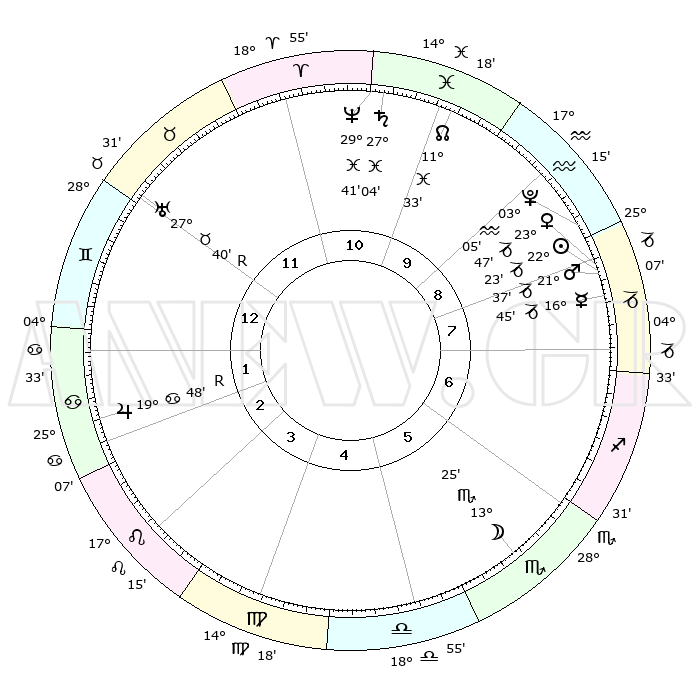 | | ΘΕΣΕΙΣ ΠΛΑΝΗΤΩΝ ΑΣΤΡΟΛΟΓΙΚΟΥ ΧΑΡΤΗ ΤΗΣ ΣΤΙΓΜΗΣ ΑΥΤΗΣ | | | | Πλανήτης | Ζώδιο | Μοίρες | Δεκαήμ. | Σε οίκο | Απόκλιση | | Ακμές των οίκων | | Ηλιος | Αιγόκερως | 22°15' | Τρίτο | 9 | 21 S 36 | | 1ος | 14°12' | Ταύρος | | Σελήνη | Σκορπιός | 11°54' | Δεύτερο | 6 | 19 S 41 | | 2ος | 12°38' | Δίδυμοι | | Ερμής | Αιγόκερως | 16°33' | Δεύτερο | 9 | 24 S 01 | | 3ος | 04°56' | Καρκίνος | | Αφροδίτη | Αιγόκερως | 23°38' | Τρίτο | 9 | 22 S 15 | | 4ος | 26°52' | Καρκίνος | | Αρης | Αιγόκερως | 21°31' | Τρίτο | 9 | 22 S 39 | | 5ος | 22°55' | Λέων | | Δίας | Καρκίνος | 19°49'R | Δεύτερο | 3 | 22 N 14 | | 6ος | 28°28' | Παρθένος | | Κρόνος | Ιχθείς | 27°03' | Τρίτο | 11 | 03 S 13 | | 7ος | 14°12' | Σκορπιός | | Ουρανός | Ταύρος | 27°41'R | Τρίτο | 1 | 19 N 27 | | 8ος | 12°38' | Τοξότης | | Ποσειδώνας | Ιχθείς | 29°41' | Τρίτο | 12 | 01 S 20 | | 9ος | 04°56' | Αιγόκερως | | Πλούτωνας | Υδροχόος | 03°05' | Πρώτο | 10 | 23 S 09 | | 10ος | 26°52' | Αιγόκερως | | Β. Δεσμός | Ιχθείς | 11°34' | Δεύτερο | 11 | 07 S 14 | | 11ος | 22°55' | Υδροχόος | | Ωροσκόπος | Ταύρος | 14°12' | Δεύτερο | | | 12ος | 28°28' | Ιχθείς | | Μεσουράνημα | Αιγόκερως | 26°52' | Τρίτο | | | |