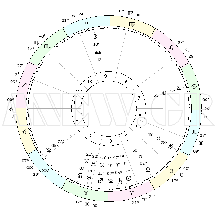 | | ΘΕΣΕΙΣ ΠΛΑΝΗΤΩΝ ΑΣΤΡΟΛΟΓΙΚΟΥ ΧΑΡΤΗ ΤΗΣ ΣΤΙΓΜΗΣ ΑΥΤΗΣ | | | | Πλανήτης | Ζώδιο | Μοίρες | Δεκαήμ. | Σε οίκο | Απόκλιση | | Ακμές των οίκων | | Ηλιος | Κριός | 12°10' | Δεύτερο | 4 | 04 N 48 | | 1ος | 09°12' | Τοξότης | | Σελήνη | Ζυγός | 09°51' | Πρώτο | 10 | 06 S 22 | | 2ος | 11°47' | Αιγόκερως | | Ερμής | Ιχθείς | 14°29' | Δεύτερο | 3 | 07 S 26 | | 3ος | 19°02' | Υδροχόος | | Αφροδίτη | Ταύρος | 02°45' | Πρώτο | 5 | 12 N 03 | | 4ος | 25°03' | Ιχθείς | | Αρης | Ιχθείς | 23°49' | Τρίτο | 3 | 03 S 24 | | 5ος | 24°48' | Κριός | | Δίας | Καρκίνος | 15°50' | Δεύτερο | 8 | 22 N 52 | | 6ος | 18°38' | Ταύρος | | Κρόνος | Κριός | 05°46' | Πρώτο | 4 | 00 N 20 | | 7ος | 09°12' | Δίδυμοι | | Ουρανός | Ταύρος | 28°48' | Τρίτο | 6 | 19 N 43 | | 8ος | 11°47' | Καρκίνος | | Ποσειδώνας | Κριός | 02°15' | Πρώτο | 4 | 00 S 19 | | 9ος | 19°02' | Λέων | | Πλούτωνας | Υδροχόος | 05°14' | Πρώτο | 2 | 22 S 47 | | 10ος | 25°03' | Παρθένος | | Β. Δεσμός | Ιχθείς | 07°21' | Πρώτο | 3 | 08 S 48 | | 11ος | 24°48' | Ζυγός | | Ωροσκόπος | Τοξότης | 09°12' | Πρώτο | | | 12ος | 18°38' | Σκορπιός | | Μεσουράνημα | Παρθένος | 25°03' | Τρίτο | | | |
