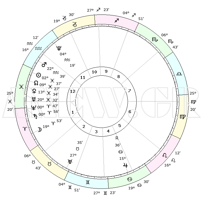 | | ΘΕΣΕΙΣ ΠΛΑΝΗΤΩΝ ΑΣΤΡΟΛΟΓΙΚΟΥ ΧΑΡΤΗ ΤΗΣ ΣΤΙΓΜΗΣ ΑΥΤΗΣ | | | | Πλανήτης | Ζώδιο | Μοίρες | Δεκαήμ. | Σε οίκο | Απόκλιση | | Ακμές των οίκων | | Ηλιος | Ιχθείς | 02°33' | Πρώτο | 1 | 10 S 34 | | 1ος | 16°27' | Υδροχόος | | Σελήνη | Κριός | 18°53' | Δεύτερο | 2 | 10 N 32 | | 2ος | 02°12' | Κριός | | Ερμής | Ιχθείς | 20°29' | Τρίτο | 1 | 02 S 21 | | 3ος | 07°38' | Ταύρος | | Αφροδίτη | Ιχθείς | 13°28' | Δεύτερο | 1 | 07 S 50 | | 4ος | 03°35' | Δίδυμοι | | Αρης | Υδροχόος | 22°36' | Τρίτο | 1 | 15 S 00 | | 5ος | 25°30' | Δίδυμοι | | Δίας | Καρκίνος | 15°36'R | Δεύτερο | 5 | 22 N 51 | | 6ος | 17°51' | Καρκίνος | | Κρόνος | Κριός | 00°55' | Πρώτο | 1 | 01 S 36 | | 7ος | 16°27' | Λέων | | Ουρανός | Ταύρος | 27°35' | Τρίτο | 3 | 19 N 26 | | 8ος | 02°12' | Ζυγός | | Ποσειδώνας | Κριός | 00°46' | Πρώτο | 1 | 00 S 54 | | 9ος | 07°38' | Σκορπιός | | Πλούτωνας | Υδροχόος | 04°19' | Πρώτο | 12 | 22 S 55 | | 10ος | 03°35' | Τοξότης | | Β. Δεσμός | Ιχθείς | 09°28' | Πρώτο | 1 | 08 S 01 | | 11ος | 25°30' | Τοξότης | | Ωροσκόπος | Υδροχόος | 16°27' | Δεύτερο | | | 12ος | 17°51' | Αιγόκερως | | Μεσουράνημα | Τοξότης | 03°35' | Πρώτο | | | |