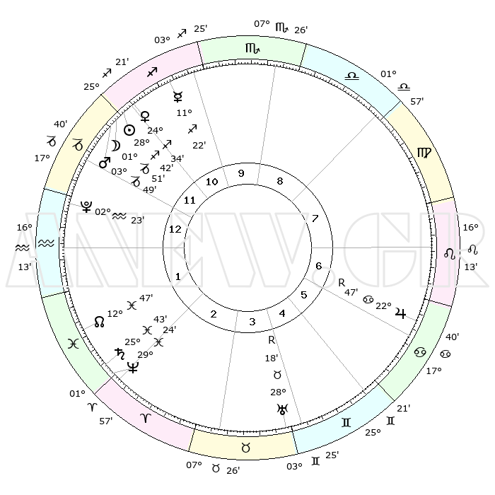 | | ΘΕΣΕΙΣ ΠΛΑΝΗΤΩΝ ΑΣΤΡΟΛΟΓΙΚΟΥ ΧΑΡΤΗ ΤΗΣ ΣΤΙΓΜΗΣ ΑΥΤΗΣ | | | | Πλανήτης | Ζώδιο | Μοίρες | Δεκαήμ. | Σε οίκο | Απόκλιση | | Ακμές των οίκων | | Ηλιος | Τοξότης | 28°38' | Τρίτο | 12 | 23 S 26 | | 1ος | 14°06' | Αιγόκερως | | Σελήνη | Αιγόκερως | 00°56' | Πρώτο | 12 | 28 S 10 | | 2ος | 24°50' | Υδροχόος | | Ερμής | Τοξότης | 11°16' | Δεύτερο | 11 | 21 S 16 | | 3ος | 04°59' | Κριός | | Αφροδίτη | Τοξότης | 24°28' | Τρίτο | 12 | 23 S 22 | | 4ος | 06°24' | Ταύρος | | Αρης | Αιγόκερως | 03°46' | Πρώτο | 12 | 24 S 11 | | 5ος | 00°43' | Δίδυμοι | | Δίας | Καρκίνος | 22°48'R | Τρίτο | 7 | 21 N 43 | | 6ος | 21°57' | Δίδυμοι | | Κρόνος | Ιχθείς | 25°43' | Τρίτο | 2 | 03 S 49 | | 7ος | 14°06' | Καρκίνος | | Ουρανός | Ταύρος | 28°18'R | Τρίτο | 4 | 19 N 35 | | 8ος | 24°50' | Λέων | | Ποσειδώνας | Ιχθείς | 29°24' | Τρίτο | 2 | 01 S 28 | | 9ος | 04°59' | Ζυγός | | Πλούτωνας | Υδροχόος | 02°23' | Πρώτο | 1 | 23 S 18 | | 10ος | 06°24' | Σκορπιός | | Β. Δεσμός | Ιχθείς | 12°47' | Δεύτερο | 2 | 06 S 45 | | 11ος | 00°43' | Τοξότης | | Ωροσκόπος | Αιγόκερως | 14°06' | Δεύτερο | | | 12ος | 21°57' | Τοξότης | | Μεσουράνημα | Σκορπιός | 06°24' | Πρώτο | | | |