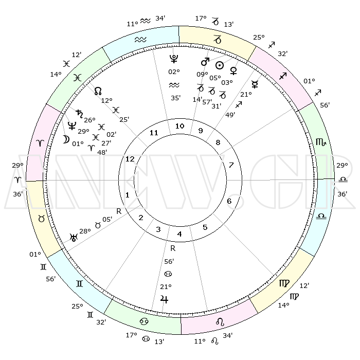 | | ΘΕΣΕΙΣ ΠΛΑΝΗΤΩΝ ΑΣΤΡΟΛΟΓΙΚΟΥ ΧΑΡΤΗ ΤΗΣ ΣΤΙΓΜΗΣ ΑΥΤΗΣ | | | | Πλανήτης | Ζώδιο | Μοίρες | Δεκαήμ. | Σε οίκο | Απόκλιση | | Ακμές των οίκων | | Ηλιος | Αιγόκερως | 05°53' | Πρώτο | 10 | 23 S 18 | | 1ος | 21°11' | Ιχθείς | | Σελήνη | Κριός | 00°54' | Πρώτο | 1 | 01 N 56 | | 2ος | 03°28' | Ταύρος | | Ερμής | Τοξότης | 21°43' | Τρίτο | 9 | 23 S 13 | | 3ος | 02°17' | Δίδυμοι | | Αφροδίτη | Αιγόκερως | 03°26' | Πρώτο | 10 | 23 S 43 | | 4ος | 25°02' | Δίδυμοι | | Αρης | Αιγόκερως | 09°11' | Πρώτο | 10 | 23 S 58 | | 5ος | 17°01' | Καρκίνος | | Δίας | Καρκίνος | 21°57'R | Τρίτο | 5 | 21 N 52 | | 6ος | 13°08' | Λέων | | Κρόνος | Ιχθείς | 26°02' | Τρίτο | 1 | 03 S 40 | | 7ος | 21°11' | Παρθένος | | Ουρανός | Ταύρος | 28°05'R | Τρίτο | 2 | 19 N 32 | | 8ος | 03°28' | Σκορπιός | | Ποσειδώνας | Ιχθείς | 29°27' | Τρίτο | 1 | 01 S 26 | | 9ος | 02°17' | Τοξότης | | Πλούτωνας | Υδροχόος | 02°35' | Πρώτο | 11 | 23 S 15 | | 10ος | 25°02' | Τοξότης | | Β. Δεσμός | Ιχθείς | 12°25' | Δεύτερο | 12 | 06 S 54 | | 11ος | 17°01' | Αιγόκερως | | Ωροσκόπος | Ιχθείς | 21°11' | Τρίτο | | | 12ος | 13°08' | Υδροχόος | | Μεσουράνημα | Τοξότης | 25°02' | Τρίτο | | | |