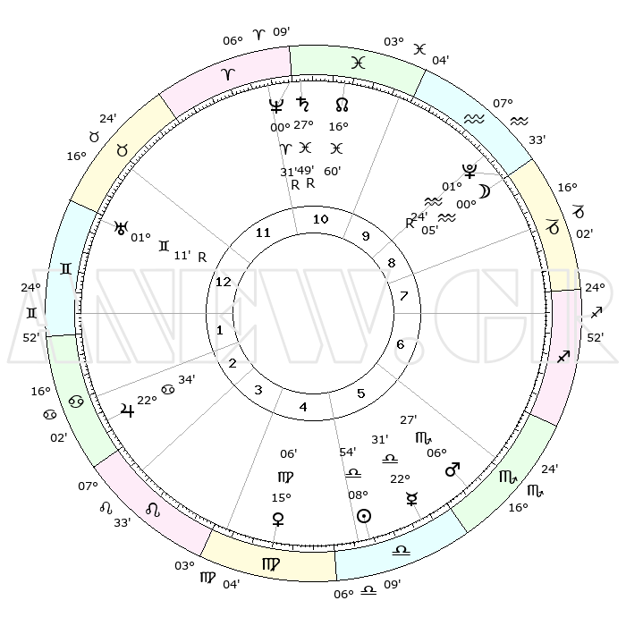 | ΘΕΣΕΙΣ ΠΛΑΝΗΤΩΝ ΑΣΤΡΟΛΟΓΙΚΟΥ ΧΑΡΤΗ ΤΗΣ ΣΤΙΓΜΗΣ ΑΥΤΗΣ | | Πλανήτης | Ζώδιο | Μοίρες | Δεκαήμ. | Σε οίκο | Απόκλιση | | Ακμές των οίκων | Ηλιος | Ζυγός | 08°49' | Πρώτο | 5 | 03 S 30 | | 1ος | 26°26' | Ταύρος | Σελήνη | Αιγόκερως | 29°09' | Τρίτο | 9 | 24 S 13 | | 2ος | 21°59' | Δίδυμοι | Ερμής | Ζυγός | 22°24' | Τρίτο | 6 | 08 S 54 | | 3ος | 13°33' | Καρκίνος | Αφροδίτη | Παρθένος | 15°01' | Δεύτερο | 5 | 07 N 06 | | 4ος | 06°04' | Λέων | Αρης | Σκορπιός | 06°23' | Πρώτο | 6 | 13 S 44 | | 5ος | 03°56' | Παρθένος | Δίας | Καρκίνος | 22°33' | Τρίτο | 3 | 21 N 34 | | 6ος | 11°47' | Ζυγός | Κρόνος | Ιχθείς | 27°50'R | Τρίτο | 11 | 03 S 10 | | 7ος | 26°26' | Σκορπιός | Ουρανός | Δίδυμοι | 01°11'R | Πρώτο | 1 | 20 N 11 | | 8ος | 21°59' | Τοξότης | Ποσειδώνας | Κριός | 00°32'R | Πρώτο | 11 | 01 S 03 | | 9ος | 13°33' | Αιγόκερως | Πλούτωνας | Υδροχόος | 01°24'R | Πρώτο | 9 | 23 S 32 | | 10ος | 06°04' | Υδροχόος | Β. Δεσμός | Ιχθείς | 17°00' | Δεύτερο | 11 | 05 S 08 | | 11ος | 03°56' | Ιχθείς | Ωροσκόπος | Ταύρος | 26°26' | Τρίτο | | | 12ος | 11°47' | Κριός | Μεσουράνημα | Υδροχόος | 06°04' | Πρώτο | | | |