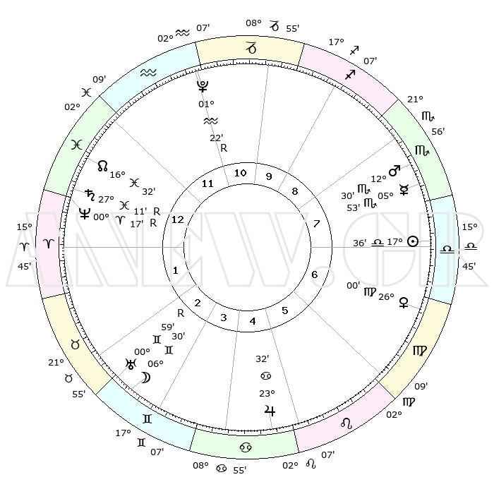 | ΘΕΣΕΙΣ ΠΛΑΝΗΤΩΝ ΑΣΤΡΟΛΟΓΙΚΟΥ ΧΑΡΤΗ ΤΗΣ ΣΤΙΓΜΗΣ ΑΥΤΗΣ | | Πλανήτης | Ζώδιο | Μοίρες | Δεκαήμ. | Σε οίκο | Απόκλιση | | Ακμές των οίκων | Ηλιος | Ζυγός | 17°24' | Δεύτερο | 9 | 06 S 50 | | 1ος | 08°32' | Αιγόκερως | Σελήνη | Δίδυμοι | 03°35' | Πρώτο | 5 | 25 N 49 | | 2ος | 17°53' | Υδροχόος | Ερμής | Σκορπιός | 05°36' | Πρώτο | 10 | 14 S 32 | | 3ος | 28°11' | Ιχθείς | Αφροδίτη | Παρθένος | 25°46' | Τρίτο | 8 | 03 N 02 | | 4ος | 00°38' | Ταύρος | Αρης | Σκορπιός | 12°22' | Δεύτερο | 10 | 15 S 43 | | 5ος | 25°40' | Ταύρος | Δίας | Καρκίνος | 23°31' | Τρίτο | 7 | 21 N 26 | | 6ος | 17°03' | Δίδυμοι | Κρόνος | Ιχθείς | 27°12'R | Τρίτο | 2 | 03 S 25 | | 7ος | 08°32' | Καρκίνος | Ουρανός | Δίδυμοι | 00°59'R | Πρώτο | 5 | 20 N 09 | | 8ος | 17°53' | Λέων | Ποσειδώνας | Κριός | 00°18'R | Πρώτο | 3 | 01 S 09 | | 9ος | 28°11' | Παρθένος | Πλούτωνας | Υδροχόος | 01°22'R | Πρώτο | 1 | 23 S 32 | | 10ος | 00°38' | Σκορπιός | Β. Δεσμός | Ιχθείς | 16°32' | Δεύτερο | 2 | 05 S 19 | | 11ος | 25°40' | Σκορπιός | Ωροσκόπος | Αιγόκερως | 08°32' | Πρώτο | | | 12ος | 17°03' | Τοξότης | Μεσουράνημα | Σκορπιός | 00°38' | Πρώτο | | | |