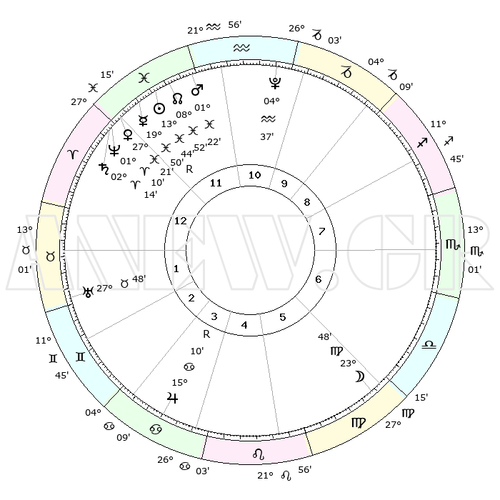 | | ΘΕΣΕΙΣ ΠΛΑΝΗΤΩΝ ΑΣΤΡΟΛΟΓΙΚΟΥ ΧΑΡΤΗ ΤΗΣ ΣΤΙΓΜΗΣ ΑΥΤΗΣ | | | | Πλανήτης | Ζώδιο | Μοίρες | Δεκαήμ. | Σε οίκο | Απόκλιση | | Ακμές των οίκων | | Ηλιος | Ιχθείς | 13°41' | Δεύτερο | 12 | 06 S 25 | | 1ος | 15°23' | Κριός | | Σελήνη | Παρθένος | 23°08' | Τρίτο | 6 | 01 N 32 | | 2ος | 21°40' | Ταύρος | | Ερμής | Ιχθείς | 19°52'R | Δεύτερο | 12 | 00 S 39 | | 3ος | 16°55' | Δίδυμοι | | Αφροδίτη | Ιχθείς | 27°17' | Τρίτο | 12 | 02 S 17 | | 4ος | 08°43' | Καρκίνος | | Αρης | Ιχθείς | 01°19' | Πρώτο | 11 | 12 S 02 | | 5ος | 01°54' | Λέων | | Δίας | Καρκίνος | 15°10'R | Δεύτερο | 4 | 22 N 55 | | 6ος | 01°51' | Παρθένος | | Κρόνος | Κριός | 02°14' | Πρώτο | 12 | 01 S 04 | | 7ος | 15°23' | Ζυγός | | Ουρανός | Ταύρος | 27°48' | Τρίτο | 2 | 19 N 30 | | 8ος | 21°40' | Σκορπιός | | Ποσειδώνας | Κριός | 01°10' | Πρώτο | 12 | 00 S 44 | | 9ος | 16°55' | Τοξότης | | Πλούτωνας | Υδροχόος | 04°37' | Πρώτο | 11 | 22 S 52 | | 10ος | 08°43' | Αιγόκερως | | Β. Δεσμός | Ιχθείς | 08°52' | Πρώτο | 12 | 08 S 14 | | 11ος | 01°54' | Υδροχόος | | Ωροσκόπος | Κριός | 15°23' | Δεύτερο | | | 12ος | 01°51' | Ιχθείς | | Μεσουράνημα | Αιγόκερως | 08°43' | Πρώτο | | | |