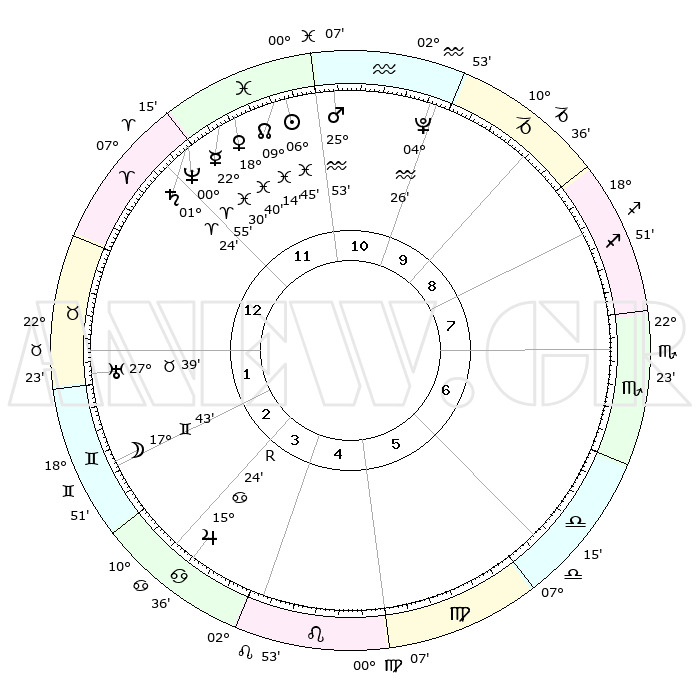 | | ΘΕΣΕΙΣ ΠΛΑΝΗΤΩΝ ΑΣΤΡΟΛΟΓΙΚΟΥ ΧΑΡΤΗ ΤΗΣ ΣΤΙΓΜΗΣ ΑΥΤΗΣ | | | | Πλανήτης | Ζώδιο | Μοίρες | Δεκαήμ. | Σε οίκο | Απόκλιση | | Ακμές των οίκων | | Ηλιος | Ιχθείς | 06°41' | Πρώτο | 12 | 09 S 03 | | 1ος | 21°07' | Κριός | | Σελήνη | Δίδυμοι | 16°51' | Δεύτερο | 2 | 27 N 59 | | 2ος | 25°49' | Ταύρος | | Ερμής | Ιχθείς | 22°29' | Τρίτο | 12 | 00 S 37 | | 3ος | 20°21' | Δίδυμοι | | Αφροδίτη | Ιχθείς | 18°36' | Δεύτερο | 12 | 05 S 48 | | 4ος | 12°04' | Καρκίνος | | Αρης | Υδροχόος | 25°50' | Τρίτο | 11 | 13 S 56 | | 5ος | 05°40' | Λέων | | Δίας | Καρκίνος | 15°24'R | Δεύτερο | 4 | 22 N 53 | | 6ος | 06°41' | Παρθένος | | Κρόνος | Κριός | 01°24' | Πρώτο | 12 | 01 S 24 | | 7ος | 21°07' | Ζυγός | | Ουρανός | Ταύρος | 27°39' | Τρίτο | 2 | 19 N 27 | | 8ος | 25°49' | Σκορπιός | | Ποσειδώνας | Κριός | 00°55' | Πρώτο | 12 | 00 S 50 | | 9ος | 20°21' | Τοξότης | | Πλούτωνας | Υδροχόος | 04°26' | Πρώτο | 10 | 22 S 53 | | 10ος | 12°04' | Αιγόκερως | | Β. Δεσμός | Ιχθείς | 09°14' | Πρώτο | 12 | 08 S 06 | | 11ος | 05°40' | Υδροχόος | | Ωροσκόπος | Κριός | 21°07' | Τρίτο | | | 12ος | 06°41' | Ιχθείς | | Μεσουράνημα | Αιγόκερως | 12°04' | Δεύτερο | | | |