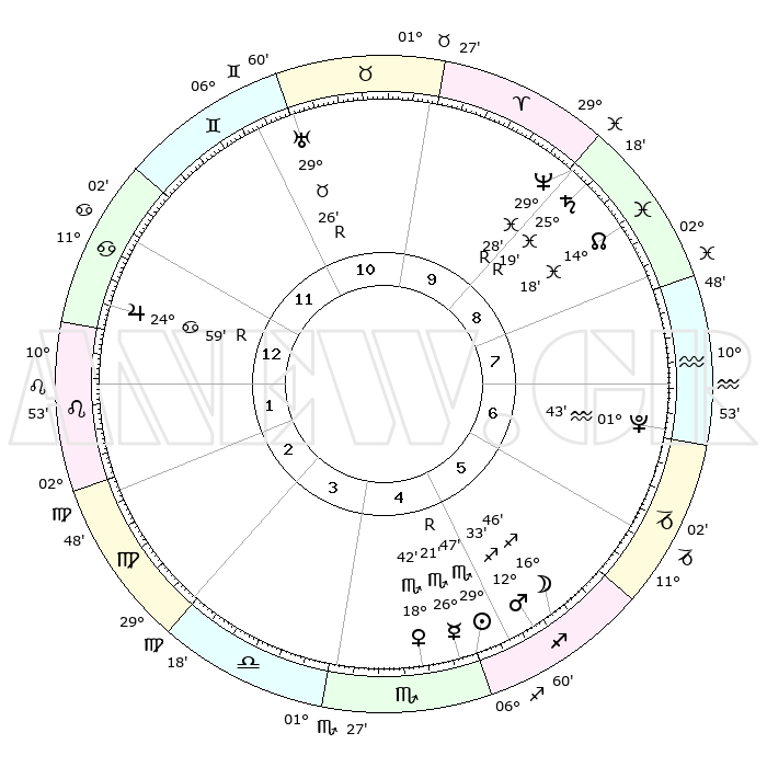 | | ΘΕΣΕΙΣ ΠΛΑΝΗΤΩΝ ΑΣΤΡΟΛΟΓΙΚΟΥ ΧΑΡΤΗ ΤΗΣ ΣΤΙΓΜΗΣ ΑΥΤΗΣ | | | | Πλανήτης | Ζώδιο | Μοίρες | Δεκαήμ. | Σε οίκο | Απόκλιση | | Ακμές των οίκων | | Ηλιος | Σκορπιός | 29°43' | Τρίτο | 5 | 20 S 05 | | 1ος | 25°30' | Καρκίνος | | Σελήνη | Τοξότης | 16°08' | Δεύτερο | 5 | 27 S 41 | | 2ος | 16°16' | Λέων | | Ερμής | Σκορπιός | 26°26'R | Τρίτο | 5 | 18 S 22 | | 3ος | 10°42' | Παρθένος | | Αφροδίτη | Σκορπιός | 18°38' | Δεύτερο | 5 | 16 S 23 | | 4ος | 11°08' | Ζυγός | | Αρης | Τοξότης | 12°31' | Δεύτερο | 5 | 22 S 52 | | 5ος | 17°14' | Σκορπιός | | Δίας | Καρκίνος | 24°59'R | Τρίτο | 12 | 21 N 16 | | 6ος | 23°42' | Τοξότης | | Κρόνος | Ιχθείς | 25°19'R | Τρίτο | 9 | 04 S 04 | | 7ος | 25°30' | Αιγόκερως | | Ουρανός | Ταύρος | 29°26'R | Τρίτο | 11 | 19 N 49 | | 8ος | 16°16' | Υδροχόος | | Ποσειδώνας | Ιχθείς | 29°28'R | Τρίτο | 9 | 01 S 27 | | 9ος | 10°42' | Ιχθείς | | Πλούτωνας | Υδροχόος | 01°43' | Πρώτο | 7 | 23 S 27 | | 10ος | 11°08' | Κριός | | Β. Δεσμός | Ιχθείς | 14°18' | Δεύτερο | 9 | 06 S 11 | | 11ος | 17°14' | Ταύρος | | Ωροσκόπος | Καρκίνος | 25°30' | Τρίτο | | | 12ος | 23°42' | Δίδυμοι | | Μεσουράνημα | Κριός | 11°08' | Δεύτερο | | | |