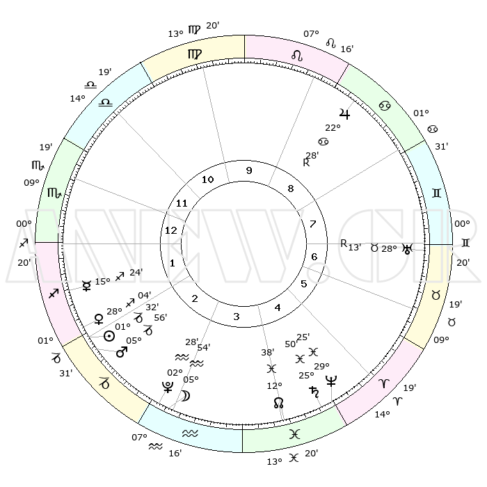| | ΘΕΣΕΙΣ ΠΛΑΝΗΤΩΝ ΑΣΤΡΟΛΟΓΙΚΟΥ ΧΑΡΤΗ ΤΗΣ ΣΤΙΓΜΗΣ ΑΥΤΗΣ | | | | Πλανήτης | Ζώδιο | Μοίρες | Δεκαήμ. | Σε οίκο | Απόκλιση | | Ακμές των οίκων | | Ηλιος | Αιγόκερως | 01°28' | Πρώτο | 2 | 23 S 25 | | 1ος | 08°59' | Σκορπιός | | Σελήνη | Υδροχόος | 04°59' | Πρώτο | 3 | 21 S 55 | | 2ος | 07°59' | Τοξότης | | Ερμής | Τοξότης | 15°17' | Δεύτερο | 2 | 22 S 07 | | 3ος | 10°46' | Αιγόκερως | | Αφροδίτη | Τοξότης | 27°58' | Τρίτο | 2 | 23 S 35 | | 4ος | 15°36' | Υδροχόος | | Αρης | Αιγόκερως | 05°53' | Πρώτο | 2 | 24 S 08 | | 5ος | 18°19' | Ιχθείς | | Δίας | Καρκίνος | 22°28'R | Τρίτο | 9 | 21 N 46 | | 6ος | 16°04' | Κριός | | Κρόνος | Ιχθείς | 25°50' | Τρίτο | 5 | 03 S 46 | | 7ος | 08°59' | Ταύρος | | Ουρανός | Ταύρος | 28°13'R | Τρίτο | 7 | 19 N 34 | | 8ος | 07°59' | Δίδυμοι | | Ποσειδώνας | Ιχθείς | 29°25' | Τρίτο | 5 | 01 S 28 | | 9ος | 10°46' | Καρκίνος | | Πλούτωνας | Υδροχόος | 02°28' | Πρώτο | 3 | 23 S 16 | | 10ος | 15°36' | Λέων | | Β. Δεσμός | Ιχθείς | 12°39' | Δεύτερο | 4 | 06 S 49 | | 11ος | 18°19' | Παρθένος | | Ωροσκόπος | Σκορπιός | 08°59' | Πρώτο | | | 12ος | 16°04' | Ζυγός | | Μεσουράνημα | Λέων | 15°36' | Δεύτερο | | | |