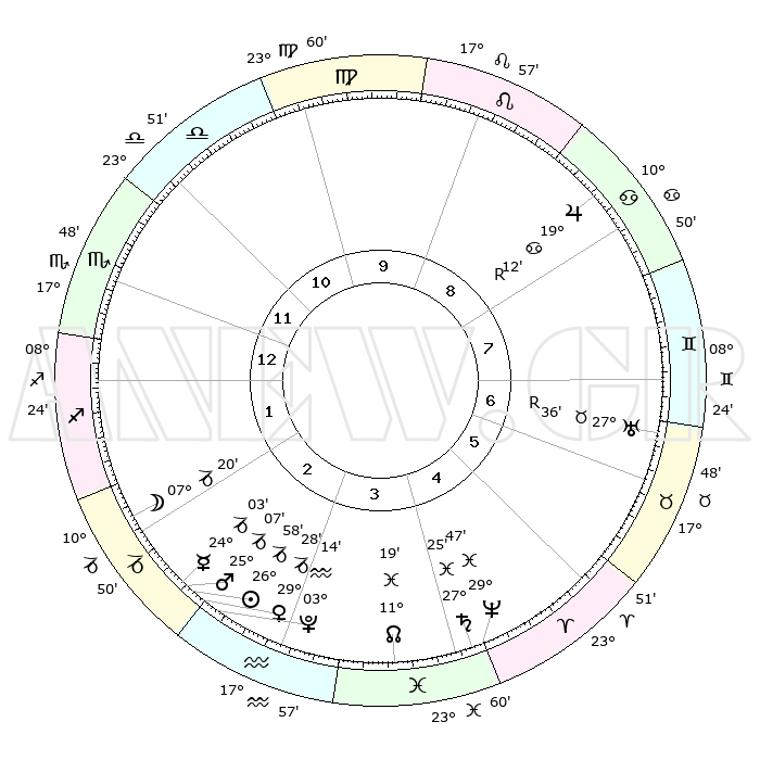 | | ΘΕΣΕΙΣ ΠΛΑΝΗΤΩΝ ΑΣΤΡΟΛΟΓΙΚΟΥ ΧΑΡΤΗ ΤΗΣ ΣΤΙΓΜΗΣ ΑΥΤΗΣ | | | | Πλανήτης | Ζώδιο | Μοίρες | Δεκαήμ. | Σε οίκο | Απόκλιση | | Ακμές των οίκων | | Ηλιος | Αιγόκερως | 26°54' | Τρίτο | 3 | 20 S 46 | | 1ος | 19°17' | Σκορπιός | | Σελήνη | Αιγόκερως | 06°32' | Πρώτο | 2 | 27 S 51 | | 2ος | 19°10' | Τοξότης | | Ερμής | Αιγόκερως | 23°57' | Τρίτο | 3 | 23 S 10 | | 3ος | 23°13' | Αιγόκερως | | Αφροδίτη | Αιγόκερως | 29°23' | Τρίτο | 3 | 21 S 17 | | 4ος | 28°47' | Υδροχόος | | Αρης | Αιγόκερως | 25°04' | Τρίτο | 3 | 22 S 05 | | 5ος | 00°54' | Κριός | | Δίας | Καρκίνος | 19°12'R | Δεύτερο | 8 | 22 N 20 | | 6ος | 27°24' | Κριός | | Κρόνος | Ιχθείς | 27°24' | Τρίτο | 4 | 03 S 04 | | 7ος | 19°17' | Ταύρος | | Ουρανός | Ταύρος | 27°36'R | Τρίτο | 7 | 19 N 26 | | 8ος | 19°10' | Δίδυμοι | | Ποσειδώνας | Ιχθείς | 29°47' | Τρίτο | 4 | 01 S 18 | | 9ος | 23°13' | Καρκίνος | | Πλούτωνας | Υδροχόος | 03°13' | Πρώτο | 3 | 23 S 07 | | 10ος | 28°47' | Λέων | | Β. Δεσμός | Ιχθείς | 11°19' | Δεύτερο | 4 | 07 S 19 | | 11ος | 00°54' | Ζυγός | | Ωροσκόπος | Σκορπιός | 19°17' | Δεύτερο | | | 12ος | 27°24' | Ζυγός | | Μεσουράνημα | Λέων | 28°47' | Τρίτο | | | |