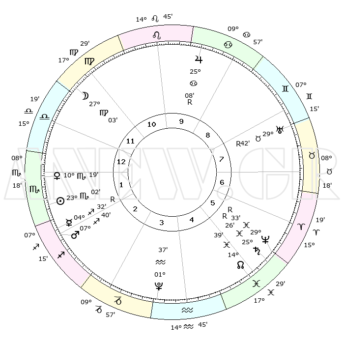 | | ΘΕΣΕΙΣ ΠΛΑΝΗΤΩΝ ΑΣΤΡΟΛΟΓΙΚΟΥ ΧΑΡΤΗ ΤΗΣ ΣΤΙΓΜΗΣ ΑΥΤΗΣ | | | | Πλανήτης | Ζώδιο | Μοίρες | Δεκαήμ. | Σε οίκο | Απόκλιση | | Ακμές των οίκων | | Ηλιος | Σκορπιός | 22°57' | Τρίτο | 2 | 18 S 30 | | 1ος | 12°45' | Ζυγός | | Σελήνη | Παρθένος | 25°59' | Τρίτο | 12 | 00 N 48 | | 2ος | 10°10' | Σκορπιός | | Ερμής | Τοξότης | 04°37'R | Πρώτο | 2 | 22 S 14 | | 3ος | 11°07' | Τοξότης | | Αφροδίτη | Σκορπιός | 10°12' | Δεύτερο | 2 | 13 S 44 | | 4ος | 14°23' | Αιγόκερως | | Αρης | Τοξότης | 07°37' | Πρώτο | 2 | 22 S 05 | | 5ος | 17°19' | Υδροχόος | | Δίας | Καρκίνος | 25°08'R | Τρίτο | 10 | 21 N 13 | | 6ος | 17°12' | Ιχθείς | | Κρόνος | Ιχθείς | 25°26'R | Τρίτο | 6 | 04 S 02 | | 7ος | 12°45' | Κριός | | Ουρανός | Ταύρος | 29°43'R | Τρίτο | 8 | 19 N 53 | | 8ος | 10°10' | Ταύρος | | Ποσειδώνας | Ιχθείς | 29°33'R | Τρίτο | 6 | 01 S 26 | | 9ος | 11°07' | Δίδυμοι | | Πλούτωνας | Υδροχόος | 01°37' | Πρώτο | 4 | 23 S 28 | | 10ος | 14°23' | Καρκίνος | | Β. Δεσμός | Ιχθείς | 14°39' | Δεύτερο | 5 | 06 S 02 | | 11ος | 17°19' | Λέων | | Ωροσκόπος | Ζυγός | 12°45' | Δεύτερο | | | 12ος | 17°12' | Παρθένος | | Μεσουράνημα | Καρκίνος | 14°23' | Δεύτερο | | | |