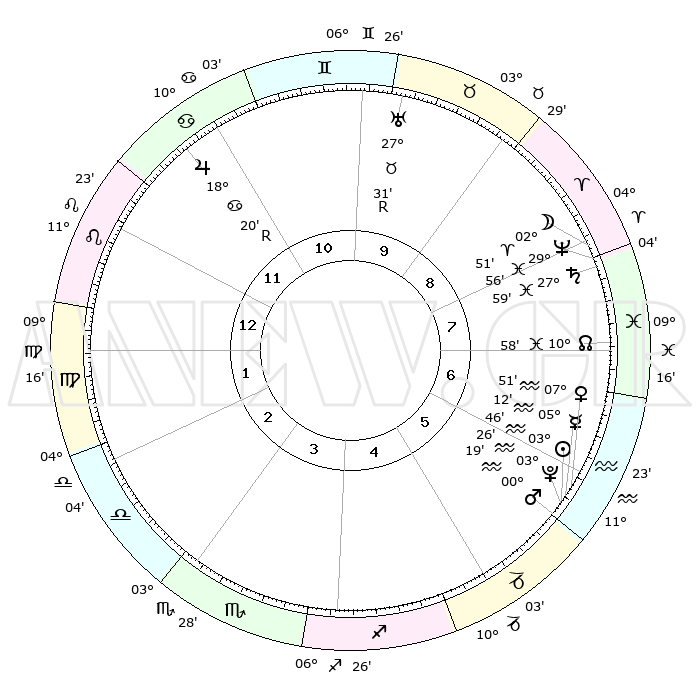 | | ΘΕΣΕΙΣ ΠΛΑΝΗΤΩΝ ΑΣΤΡΟΛΟΓΙΚΟΥ ΧΑΡΤΗ ΤΗΣ ΣΤΙΓΜΗΣ ΑΥΤΗΣ | | | | Πλανήτης | Ζώδιο | Μοίρες | Δεκαήμ. | Σε οίκο | Απόκλιση | | Ακμές των οίκων | | Ηλιος | Υδροχόος | 03°43' | Πρώτο | 6 | 19 S 19 | | 1ος | 23°29' | Λέων | | Σελήνη | Κριός | 02°07' | Πρώτο | 8 | 02 N 42 | | 2ος | 16°40' | Παρθένος | | Ερμής | Υδροχόος | 05°06' | Πρώτο | 6 | 21 S 00 | | 3ος | 14°41' | Ζυγός | | Αφροδίτη | Υδροχόος | 07°47' | Πρώτο | 6 | 19 S 29 | | 4ος | 17°29' | Σκορπιός | | Αρης | Υδροχόος | 00°16' | Πρώτο | 6 | 21 S 04 | | 5ος | 22°08' | Τοξότης | | Δίας | Καρκίνος | 18°20'R | Δεύτερο | 11 | 22 N 28 | | 6ος | 24°40' | Αιγόκερως | | Κρόνος | Ιχθείς | 27°59' | Τρίτο | 8 | 02 S 49 | | 7ος | 23°29' | Υδροχόος | | Ουρανός | Ταύρος | 27°31'R | Τρίτο | 10 | 19 N 25 | | 8ος | 16°40' | Ιχθείς | | Ποσειδώνας | Ιχθείς | 29°56' | Τρίτο | 8 | 01 S 14 | | 9ος | 14°41' | Κριός | | Πλούτωνας | Υδροχόος | 03°26' | Πρώτο | 6 | 23 S 04 | | 10ος | 17°29' | Ταύρος | | Β. Δεσμός | Ιχθείς | 10°58' | Δεύτερο | 7 | 07 S 27 | | 11ος | 22°08' | Δίδυμοι | | Ωροσκόπος | Λέων | 23°29' | Τρίτο | | | 12ος | 24°40' | Καρκίνος | | Μεσουράνημα | Ταύρος | 17°29' | Δεύτερο | | | |