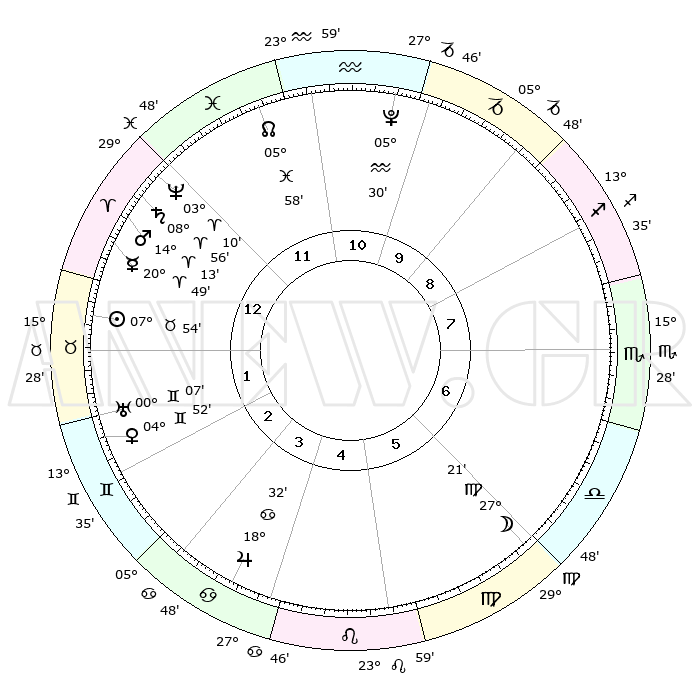 | | ΘΕΣΕΙΣ ΠΛΑΝΗΤΩΝ ΑΣΤΡΟΛΟΓΙΚΟΥ ΧΑΡΤΗ ΤΗΣ ΣΤΙΓΜΗΣ ΑΥΤΗΣ | | | | Πλανήτης | Ζώδιο | Μοίρες | Δεκαήμ. | Σε οίκο | Απόκλιση | | Ακμές των οίκων | | Ηλιος | Ταύρος | 07°47' | Πρώτο | 2 | 14 N 06 | | 1ος | 04°47' | Ιχθείς | | Σελήνη | Παρθένος | 25°45' | Τρίτο | 7 | 00 N 13 | | 2ος | 19°44' | Κριός | | Ερμής | Κριός | 20°35' | Τρίτο | 2 | 05 N 59 | | 3ος | 21°31' | Ταύρος | | Αφροδίτη | Δίδυμοι | 04°43' | Πρώτο | 3 | 21 N 50 | | 4ος | 15°29' | Δίδυμοι | | Αρης | Κριός | 14°07' | Δεύτερο | 1 | 04 N 44 | | 5ος | 07°10' | Καρκίνος | | Δίας | Καρκίνος | 18°31' | Δεύτερο | 5 | 22 N 32 | | 6ος | 01°14' | Λέων | | Κρόνος | Κριός | 08°56' | Πρώτο | 1 | 01 N 33 | | 7ος | 04°47' | Παρθένος | | Ουρανός | Δίδυμοι | 00°07' | Πρώτο | 3 | 20 N 00 | | 8ος | 19°44' | Ζυγός | | Ποσειδώνας | Κριός | 03°10' | Πρώτο | 1 | 00 N 03 | | 9ος | 21°31' | Σκορπιός | | Πλούτωνας | Υδροχόος | 05°29' | Πρώτο | 12 | 22 S 48 | | 10ος | 15°29' | Τοξότης | | Β. Δεσμός | Ιχθείς | 05°58' | Πρώτο | 1 | 09 S 19 | | 11ος | 07°10' | Αιγόκερως | | Ωροσκόπος | Ιχθείς | 04°47' | Πρώτο | | | 12ος | 01°14' | Υδροχόος | | Μεσουράνημα | Τοξότης | 15°29' | Δεύτερο | | | |