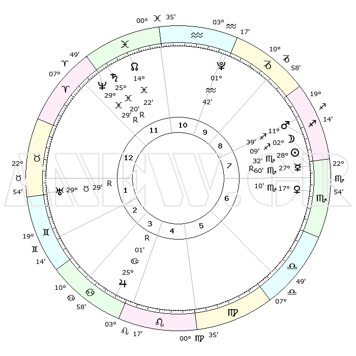 | | ΘΕΣΕΙΣ ΠΛΑΝΗΤΩΝ ΑΣΤΡΟΛΟΓΙΚΟΥ ΧΑΡΤΗ ΤΗΣ ΣΤΙΓΜΗΣ ΑΥΤΗΣ | | | | Πλανήτης | Ζώδιο | Μοίρες | Δεκαήμ. | Σε οίκο | Απόκλιση | | Ακμές των οίκων | | Ηλιος | Σκορπιός | 28°28' | Τρίτο | 8 | 19 S 49 | | 1ος | 16°14' | Κριός | | Σελήνη | Τοξότης | 01°19' | Πρώτο | 8 | 25 S 10 | | 2ος | 22°16' | Ταύρος | | Ερμής | Σκορπιός | 28°06'R | Τρίτο | 8 | 19 S 09 | | 3ος | 17°24' | Δίδυμοι | | Αφροδίτη | Σκορπιός | 17°04' | Δεύτερο | 7 | 15 S 55 | | 4ος | 09°12' | Καρκίνος | | Αρης | Τοξότης | 11°36' | Δεύτερο | 8 | 22 S 44 | | 5ος | 02°26' | Λέων | | Δίας | Καρκίνος | 25°01'R | Τρίτο | 4 | 21 N 15 | | 6ος | 02°33' | Παρθένος | | Κρόνος | Ιχθείς | 25°20'R | Τρίτο | 12 | 04 S 04 | | 7ος | 16°13' | Ζυγός | | Ουρανός | Ταύρος | 29°29'R | Τρίτο | 2 | 19 N 50 | | 8ος | 22°16' | Σκορπιός | | Ποσειδώνας | Ιχθείς | 29°29'R | Τρίτο | 12 | 01 S 27 | | 9ος | 17°24' | Τοξότης | | Πλούτωνας | Υδροχόος | 01°42' | Πρώτο | 10 | 23 S 27 | | 10ος | 09°12' | Αιγόκερως | | Β. Δεσμός | Ιχθείς | 14°22' | Δεύτερο | 12 | 06 S 09 | | 11ος | 02°26' | Υδροχόος | | Ωροσκόπος | Κριός | 16°14' | Δεύτερο | | | 12ος | 02°33' | Ιχθείς | | Μεσουράνημα | Αιγόκερως | 09°12' | Πρώτο | | | |