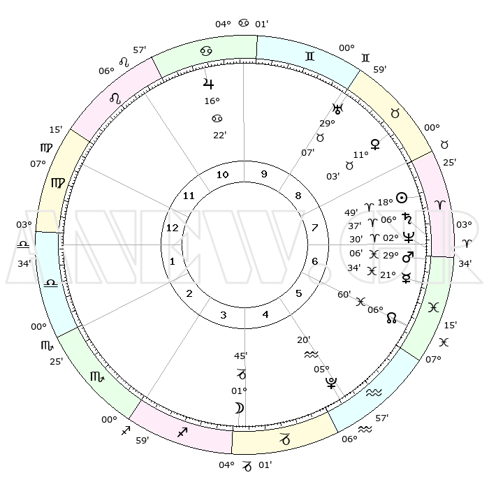 | | ΘΕΣΕΙΣ ΠΛΑΝΗΤΩΝ ΑΣΤΡΟΛΟΓΙΚΟΥ ΧΑΡΤΗ ΤΗΣ ΣΤΙΓΜΗΣ ΑΥΤΗΣ | | | | Πλανήτης | Ζώδιο | Μοίρες | Δεκαήμ. | Σε οίκο | Απόκλιση | | Ακμές των οίκων | | Ηλιος | Κριός | 18°46' | Δεύτερο | 8 | 07 N 21 | | 1ος | 16°59' | Παρθένος | | Σελήνη | Αιγόκερως | 01°05' | Πρώτο | 4 | 28 S 11 | | 2ος | 12°31' | Ζυγός | | Ερμής | Ιχθείς | 21°30' | Τρίτο | 7 | 05 S 25 | | 3ος | 12°23' | Σκορπιός | | Αφροδίτη | Ταύρος | 10°59' | Δεύτερο | 8 | 15 N 00 | | 4ος | 15°19' | Τοξότης | | Αρης | Ιχθείς | 29°03' | Τρίτο | 7 | 01 S 18 | | 5ος | 18°36' | Αιγόκερως | | Δίας | Καρκίνος | 16°21' | Δεύτερο | 10 | 22 N 48 | | 6ος | 19°33' | Υδροχόος | | Κρόνος | Κριός | 06°36' | Πρώτο | 7 | 00 N 39 | | 7ος | 16°59' | Ιχθείς | | Ουρανός | Ταύρος | 29°07' | Τρίτο | 9 | 19 N 47 | | 8ος | 12°31' | Κριός | | Ποσειδώνας | Κριός | 02°30' | Πρώτο | 7 | 00 S 13 | | 9ος | 12°23' | Ταύρος | | Πλούτωνας | Υδροχόος | 05°20' | Πρώτο | 5 | 22 S 47 | | 10ος | 15°19' | Δίδυμοι | | Β. Δεσμός | Ιχθείς | 07°00' | Πρώτο | 6 | 08 S 56 | | 11ος | 18°36' | Καρκίνος | | Ωροσκόπος | Παρθένος | 16°59' | Δεύτερο | | | 12ος | 19°33' | Λέων | | Μεσουράνημα | Δίδυμοι | 15°19' | Δεύτερο | | | |