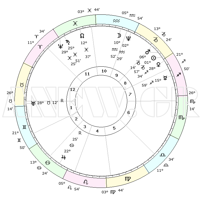 | | ΘΕΣΕΙΣ ΠΛΑΝΗΤΩΝ ΑΣΤΡΟΛΟΓΙΚΟΥ ΧΑΡΤΗ ΤΗΣ ΣΤΙΓΜΗΣ ΑΥΤΗΣ | | | | Πλανήτης | Ζώδιο | Μοίρες | Δεκαήμ. | Σε οίκο | Απόκλιση | | Ακμές των οίκων | | Ηλιος | Αιγόκερως | 01°51' | Πρώτο | 9 | 23 S 25 | | 1ος | 12°55' | Κριός | | Σελήνη | Υδροχόος | 09°49' | Πρώτο | 11 | 20 S 20 | | 2ος | 19°52' | Ταύρος | | Ερμής | Τοξότης | 15°51' | Δεύτερο | 9 | 22 S 14 | | 3ος | 15°26' | Δίδυμοι | | Αφροδίτη | Τοξότης | 28°27' | Τρίτο | 9 | 23 S 36 | | 4ος | 07°18' | Καρκίνος | | Αρης | Αιγόκερως | 06°10' | Πρώτο | 9 | 24 S 07 | | 5ος | 00°18' | Λέων | | Δίας | Καρκίνος | 22°26'R | Τρίτο | 4 | 21 N 47 | | 6ος | 29°50' | Λέων | | Κρόνος | Ιχθείς | 25°51' | Τρίτο | 12 | 03 S 45 | | 7ος | 12°55' | Ζυγός | | Ουρανός | Ταύρος | 28°12'R | Τρίτο | 2 | 19 N 34 | | 8ος | 19°52' | Σκορπιός | | Ποσειδώνας | Ιχθείς | 29°25' | Τρίτο | 12 | 01 S 27 | | 9ος | 15°26' | Τοξότης | | Πλούτωνας | Υδροχόος | 02°28' | Πρώτο | 11 | 23 S 16 | | 10ος | 07°18' | Αιγόκερως | | Β. Δεσμός | Ιχθείς | 12°37' | Δεύτερο | 12 | 06 S 49 | | 11ος | 00°18' | Υδροχόος | | Ωροσκόπος | Κριός | 12°55' | Δεύτερο | | | 12ος | 29°50' | Υδροχόος | | Μεσουράνημα | Αιγόκερως | 07°18' | Πρώτο | | | |