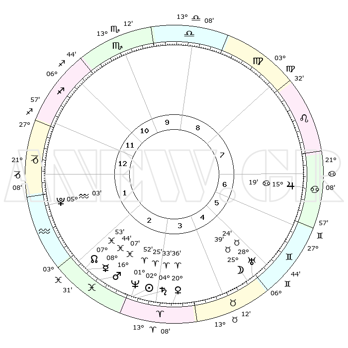 | | ΘΕΣΕΙΣ ΠΛΑΝΗΤΩΝ ΑΣΤΡΟΛΟΓΙΚΟΥ ΧΑΡΤΗ ΤΗΣ ΣΤΙΓΜΗΣ ΑΥΤΗΣ | | | | Πλανήτης | Ζώδιο | Μοίρες | Δεκαήμ. | Σε οίκο | Απόκλιση | | Ακμές των οίκων | | Ηλιος | Κριός | 02°21' | Πρώτο | 3 | 00 N 56 | | 1ος | 25°26' | Τοξότης | | Σελήνη | Ταύρος | 24°35' | Τρίτο | 5 | 23 N 50 | | 2ος | 01°27' | Υδροχόος | | Ερμής | Ιχθείς | 08°43' | Πρώτο | 2 | 07 S 52 | | 3ος | 11°03' | Ιχθείς | | Αφροδίτη | Κριός | 20°31' | Τρίτο | 4 | 07 N 17 | | 4ος | 15°40' | Κριός | | Αρης | Ιχθείς | 16°03' | Δεύτερο | 3 | 06 S 29 | | 5ος | 12°44' | Ταύρος | | Δίας | Καρκίνος | 15°19' | Δεύτερο | 7 | 22 N 55 | | 6ος | 04°52' | Δίδυμοι | | Κρόνος | Κριός | 04°32' | Πρώτο | 3 | 00 S 09 | | 7ος | 25°26' | Δίδυμοι | | Ουρανός | Ταύρος | 28°24' | Τρίτο | 5 | 19 N 38 | | 8ος | 01°27' | Λέων | | Ποσειδώνας | Κριός | 01°52' | Πρώτο | 3 | 00 S 27 | | 9ος | 11°03' | Παρθένος | | Πλούτωνας | Υδροχόος | 05°03' | Πρώτο | 2 | 22 S 48 | | 10ος | 15°40' | Ζυγός | | Β. Δεσμός | Ιχθείς | 07°53' | Πρώτο | 2 | 08 S 37 | | 11ος | 12°44' | Σκορπιός | | Ωροσκόπος | Τοξότης | 25°26' | Τρίτο | | | 12ος | 04°52' | Τοξότης | | Μεσουράνημα | Ζυγός | 15°40' | Δεύτερο | | | |