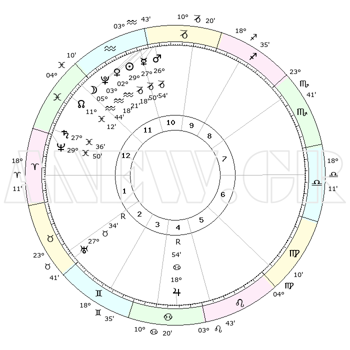 | | ΘΕΣΕΙΣ ΠΛΑΝΗΤΩΝ ΑΣΤΡΟΛΟΓΙΚΟΥ ΧΑΡΤΗ ΤΗΣ ΣΤΙΓΜΗΣ ΑΥΤΗΣ | | | | Πλανήτης | Ζώδιο | Μοίρες | Δεκαήμ. | Σε οίκο | Απόκλιση | | Ακμές των οίκων | | Ηλιος | Αιγόκερως | 29°14' | Τρίτο | 11 | 20 S 18 | | 1ος | 08°33' | Ιχθείς | | Σελήνη | Υδροχόος | 04°53' | Πρώτο | 12 | 21 S 53 | | 2ος | 23°03' | Κριός | | Ερμής | Αιγόκερως | 27°43' | Τρίτο | 11 | 22 S 34 | | 3ος | 24°07' | Ταύρος | | Αφροδίτη | Υδροχόος | 02°15' | Πρώτο | 11 | 20 S 43 | | 4ος | 17°44' | Δίδυμοι | | Αρης | Αιγόκερως | 26°50' | Τρίτο | 11 | 21 S 45 | | 5ος | 09°27' | Καρκίνος | | Δίας | Καρκίνος | 18°54'R | Δεύτερο | 5 | 22 N 23 | | 6ος | 03°57' | Λέων | | Κρόνος | Ιχθείς | 27°36' | Τρίτο | 1 | 02 S 59 | | 7ος | 08°33' | Παρθένος | | Ουρανός | Ταύρος | 27°34'R | Τρίτο | 3 | 19 N 25 | | 8ος | 23°03' | Ζυγός | | Ποσειδώνας | Ιχθείς | 29°50' | Τρίτο | 1 | 01 S 17 | | 9ος | 24°07' | Σκορπιός | | Πλούτωνας | Υδροχόος | 03°18' | Πρώτο | 11 | 23 S 06 | | 10ος | 17°44' | Τοξότης | | Β. Δεσμός | Ιχθείς | 11°12' | Δεύτερο | 1 | 07 S 22 | | 11ος | 09°27' | Αιγόκερως | | Ωροσκόπος | Ιχθείς | 08°33' | Πρώτο | | | 12ος | 03°57' | Υδροχόος | | Μεσουράνημα | Τοξότης | 17°44' | Δεύτερο | | | |