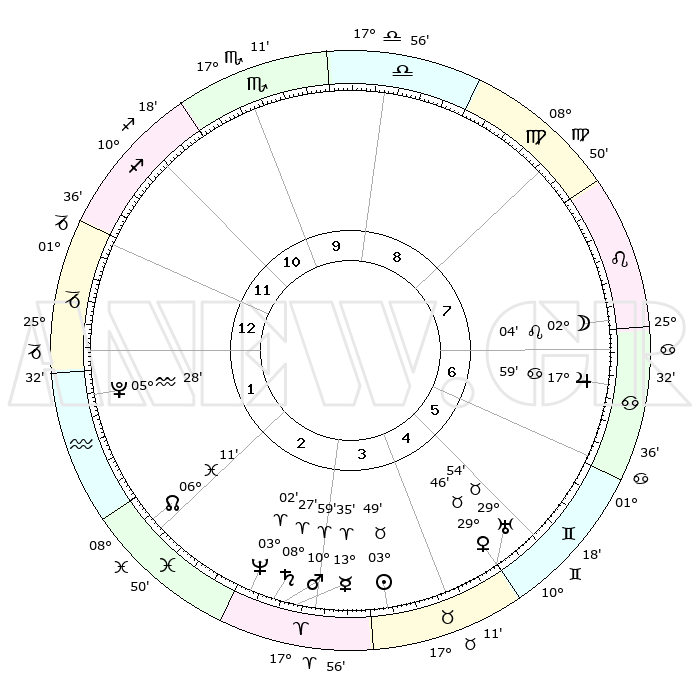 | | ΘΕΣΕΙΣ ΠΛΑΝΗΤΩΝ ΑΣΤΡΟΛΟΓΙΚΟΥ ΧΑΡΤΗ ΤΗΣ ΣΤΙΓΜΗΣ ΑΥΤΗΣ | | | | Πλανήτης | Ζώδιο | Μοίρες | Δεκαήμ. | Σε οίκο | Απόκλιση | | Ακμές των οίκων | | Ηλιος | Ταύρος | 03°45' | Πρώτο | 4 | 12 N 46 | | 1ος | 01°04' | Αιγόκερως | | Σελήνη | Λέων | 01°09' | Πρώτο | 7 | 22 N 51 | | 2ος | 08°30' | Υδροχόος | | Ερμής | Κριός | 13°28' | Δεύτερο | 3 | 03 N 01 | | 3ος | 18°34' | Ιχθείς | | Αφροδίτη | Ταύρος | 29°41' | Τρίτο | 5 | 20 N 39 | | 4ος | 22°20' | Κριός | | Αρης | Κριός | 10°56' | Δεύτερο | 3 | 03 N 28 | | 5ος | 18°29' | Ταύρος | | Δίας | Καρκίνος | 17°59' | Δεύτερο | 7 | 22 N 36 | | 6ος | 10°13' | Δίδυμοι | | Κρόνος | Κριός | 08°27' | Πρώτο | 3 | 01 N 22 | | 7ος | 01°05' | Καρκίνος | | Ουρανός | Ταύρος | 29°53' | Τρίτο | 5 | 19 N 58 | | 8ος | 08°30' | Λέων | | Ποσειδώνας | Κριός | 03°02' | Πρώτο | 3 | 00 S 00 | | 9ος | 18°34' | Παρθένος | | Πλούτωνας | Υδροχόος | 05°28' | Πρώτο | 1 | 22 S 48 | | 10ος | 22°20' | Ζυγός | | Β. Δεσμός | Ιχθείς | 06°11' | Πρώτο | 2 | 09 S 14 | | 11ος | 18°29' | Σκορπιός | | Ωροσκόπος | Αιγόκερως | 01°04' | Πρώτο | | | 12ος | 10°13' | Τοξότης | | Μεσουράνημα | Ζυγός | 22°20' | Τρίτο | | | |