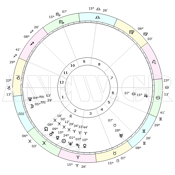 | | ΘΕΣΕΙΣ ΠΛΑΝΗΤΩΝ ΑΣΤΡΟΛΟΓΙΚΟΥ ΧΑΡΤΗ ΤΗΣ ΣΤΙΓΜΗΣ ΑΥΤΗΣ | | | | Πλανήτης | Ζώδιο | Μοίρες | Δεκαήμ. | Σε οίκο | Απόκλιση | | Ακμές των οίκων | | Ηλιος | Ιχθείς | 24°26' | Τρίτο | 3 | 02 S 13 | | 1ος | 01°56' | Αιγόκερως | | Σελήνη | Υδροχόος | 04°45' | Πρώτο | 1 | 21 S 57 | | 2ος | 09°35' | Υδροχόος | | Ερμής | Ιχθείς | 10°14'R | Δεύτερο | 2 | 05 S 30 | | 3ος | 19°42' | Ιχθείς | | Αφροδίτη | Κριός | 10°39' | Δεύτερο | 3 | 03 N 15 | | 4ος | 23°20' | Κριός | | Αρης | Ιχθείς | 09°48' | Πρώτο | 2 | 08 S 54 | | 5ος | 19°20' | Ταύρος | | Δίας | Καρκίνος | 15°07' | Δεύτερο | 7 | 22 N 56 | | 6ος | 11°01' | Δίδυμοι | | Κρόνος | Κριός | 03°33' | Πρώτο | 3 | 00 S 32 | | 7ος | 01°56' | Καρκίνος | | Ουρανός | Ταύρος | 28°07' | Τρίτο | 5 | 19 N 34 | | 8ος | 09°35' | Λέων | | Ποσειδώνας | Κριός | 01°34' | Πρώτο | 3 | 00 S 35 | | 9ος | 19°42' | Παρθένος | | Πλούτωνας | Υδροχόος | 04°53' | Πρώτο | 1 | 22 S 49 | | 10ος | 23°20' | Ζυγός | | Β. Δεσμός | Ιχθείς | 08°18' | Πρώτο | 2 | 08 S 27 | | 11ος | 19°20' | Σκορπιός | | Ωροσκόπος | Αιγόκερως | 01°56' | Πρώτο | | | 12ος | 11°01' | Τοξότης | | Μεσουράνημα | Ζυγός | 23°20' | Τρίτο | | | |