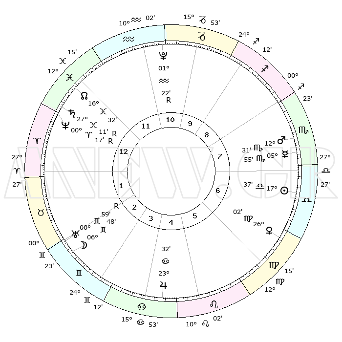 | ΘΕΣΕΙΣ ΠΛΑΝΗΤΩΝ ΑΣΤΡΟΛΟΓΙΚΟΥ ΧΑΡΤΗ ΤΗΣ ΣΤΙΓΜΗΣ ΑΥΤΗΣ | | Πλανήτης | Ζώδιο | Μοίρες | Δεκαήμ. | Σε οίκο | Απόκλιση | | Ακμές των οίκων | Ηλιος | Ζυγός | 17°26' | Δεύτερο | 9 | 06 S 51 | | 1ος | 20°22' | Αιγόκερως | Σελήνη | Δίδυμοι | 04°03' | Πρώτο | 4 | 25 N 55 | | 2ος | 02°35' | Ιχθείς | Ερμής | Σκορπιός | 05°38' | Πρώτο | 9 | 14 S 33 | | 3ος | 12°17' | Κριός | Αφροδίτη | Παρθένος | 25°48' | Τρίτο | 8 | 03 N 01 | | 4ος | 12°30' | Ταύρος | Αρης | Σκορπιός | 12°23' | Δεύτερο | 9 | 15 S 43 | | 5ος | 06°06' | Δίδυμοι | Δίας | Καρκίνος | 23°31' | Τρίτο | 7 | 21 N 26 | | 6ος | 27°19' | Δίδυμοι | Κρόνος | Ιχθείς | 27°12'R | Τρίτο | 2 | 03 S 25 | | 7ος | 20°22' | Καρκίνος | Ουρανός | Δίδυμοι | 00°59'R | Πρώτο | 4 | 20 N 09 | | 8ος | 02°35' | Παρθένος | Ποσειδώνας | Κριός | 00°18'R | Πρώτο | 2 | 01 S 09 | | 9ος | 12°17' | Ζυγός | Πλούτωνας | Υδροχόος | 01°22'R | Πρώτο | 1 | 23 S 32 | | 10ος | 12°30' | Σκορπιός | Β. Δεσμός | Ιχθείς | 16°32' | Δεύτερο | 2 | 05 S 19 | | 11ος | 06°06' | Τοξότης | Ωροσκόπος | Αιγόκερως | 20°22' | Τρίτο | | | 12ος | 27°19' | Τοξότης | Μεσουράνημα | Σκορπιός | 12°30' | Δεύτερο | | | |