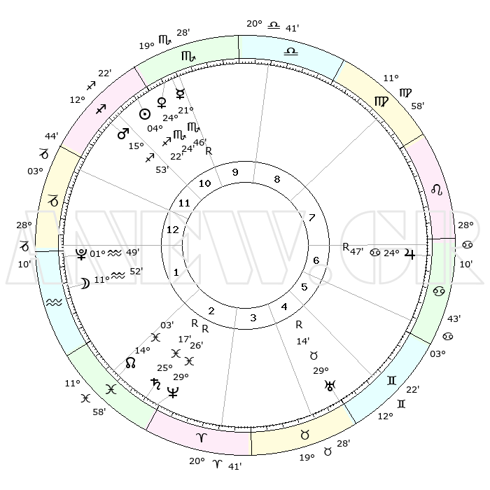| | ΘΕΣΕΙΣ ΠΛΑΝΗΤΩΝ ΑΣΤΡΟΛΟΓΙΚΟΥ ΧΑΡΤΗ ΤΗΣ ΣΤΙΓΜΗΣ ΑΥΤΗΣ | | | | Πλανήτης | Ζώδιο | Μοίρες | Δεκαήμ. | Σε οίκο | Απόκλιση | | Ακμές των οίκων | | Ηλιος | Τοξότης | 04°21' | Πρώτο | 10 | 21 S 00 | | 1ος | 25°01' | Αιγόκερως | | Σελήνη | Υδροχόος | 11°46' | Δεύτερο | 1 | 19 S 52 | | 2ος | 08°13' | Ιχθείς | | Ερμής | Σκορπιός | 21°46'R | Τρίτο | 10 | 16 S 07 | | 3ος | 17°23' | Κριός | | Αφροδίτη | Σκορπιός | 24°24' | Τρίτο | 10 | 18 S 01 | | 4ος | 16°43' | Ταύρος | | Αρης | Τοξότης | 15°53' | Δεύτερο | 11 | 23 S 18 | | 5ος | 09°53' | Δίδυμοι | | Δίας | Καρκίνος | 24°47'R | Τρίτο | 6 | 21 N 18 | | 6ος | 01°10' | Καρκίνος | | Κρόνος | Ιχθείς | 25°17'R | Τρίτο | 2 | 04 S 04 | | 7ος | 25°01' | Καρκίνος | | Ουρανός | Ταύρος | 29°14'R | Τρίτο | 4 | 19 N 47 | | 8ος | 08°13' | Παρθένος | | Ποσειδώνας | Ιχθείς | 29°26'R | Τρίτο | 2 | 01 S 28 | | 9ος | 17°23' | Ζυγός | | Πλούτωνας | Υδροχόος | 01°49' | Πρώτο | 1 | 23 S 25 | | 10ος | 16°43' | Σκορπιός | | Β. Δεσμός | Ιχθείς | 14°03' | Δεύτερο | 2 | 06 S 16 | | 11ος | 09°53' | Τοξότης | | Ωροσκόπος | Αιγόκερως | 25°01' | Τρίτο | | | 12ος | 01°10' | Αιγόκερως | | Μεσουράνημα | Σκορπιός | 16°43' | Δεύτερο | | | |