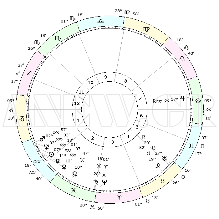| | ΘΕΣΕΙΣ ΠΛΑΝΗΤΩΝ ΑΣΤΡΟΛΟΓΙΚΟΥ ΧΑΡΤΗ ΤΗΣ ΣΤΙΓΜΗΣ ΑΥΤΗΣ | | | | Πλανήτης | Ζώδιο | Μοίρες | Δεκαήμ. | Σε οίκο | Απόκλιση | | Ακμές των οίκων | | Ηλιος | Υδροχόος | 07°05' | Πρώτο | 3 | 18 S 30 | | 1ος | 26°12' | Σκορπιός | | Σελήνη | Ταύρος | 17°55' | Δεύτερο | 6 | 21 N 49 | | 2ος | 26°50' | Τοξότης | | Ερμής | Υδροχόος | 10°47' | Δεύτερο | 3 | 19 S 31 | | 3ος | 01°56' | Υδροχόος | | Αφροδίτη | Υδροχόος | 11°57' | Δεύτερο | 3 | 18 S 26 | | 4ος | 07°51' | Ιχθείς | | Αρης | Υδροχόος | 02°51' | Πρώτο | 3 | 20 S 31 | | 5ος | 09°20' | Κριός | | Δίας | Καρκίνος | 17°56'R | Δεύτερο | 8 | 22 N 31 | | 6ος | 04°54' | Ταύρος | | Κρόνος | Ιχθείς | 28°17' | Τρίτο | 4 | 02 S 41 | | 7ος | 26°12' | Ταύρος | | Ουρανός | Ταύρος | 27°29'R | Τρίτο | 7 | 19 N 24 | | 8ος | 26°50' | Δίδυμοι | | Ποσειδώνας | Κριός | 00°01' | Πρώτο | 4 | 01 S 12 | | 9ος | 01°56' | Λέων | | Πλούτωνας | Υδροχόος | 03°33' | Πρώτο | 3 | 23 S 03 | | 10ος | 07°51' | Παρθένος | | Β. Δεσμός | Ιχθείς | 10°47' | Δεύτερο | 4 | 07 S 31 | | 11ος | 09°20' | Ζυγός | | Ωροσκόπος | Σκορπιός | 26°12' | Τρίτο | | | 12ος | 04°54' | Σκορπιός | | Μεσουράνημα | Παρθένος | 07°51' | Πρώτο | | | |