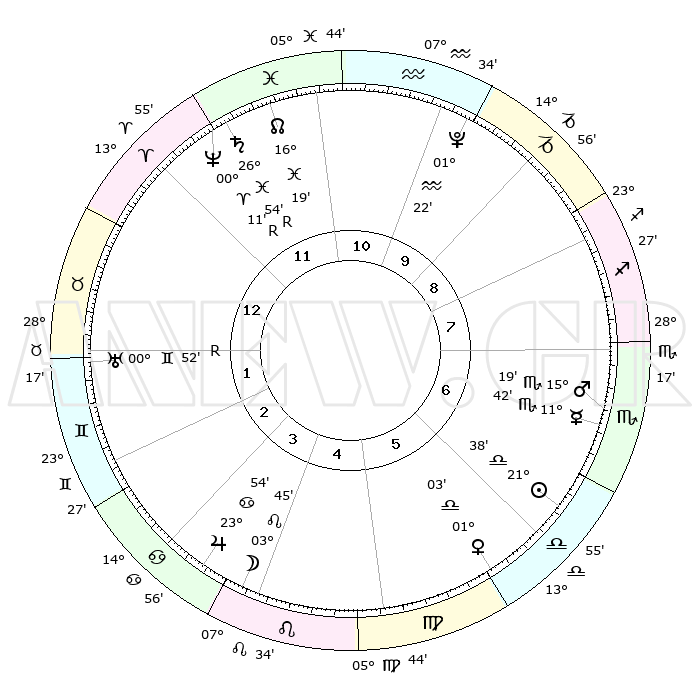 | ΘΕΣΕΙΣ ΠΛΑΝΗΤΩΝ ΑΣΤΡΟΛΟΓΙΚΟΥ ΧΑΡΤΗ ΤΗΣ ΣΤΙΓΜΗΣ ΑΥΤΗΣ | | Πλανήτης | Ζώδιο | Μοίρες | Δεκαήμ. | Σε οίκο | Απόκλιση | | Ακμές των οίκων | Ηλιος | Ζυγός | 21°28' | Τρίτο | 8 | 08 S 22 | | 1ος | 00°44' | Ιχθείς | Σελήνη | Λέων | 01°36' | Πρώτο | 6 | 23 N 29 | | 2ος | 16°06' | Κριός | Ερμής | Σκορπιός | 11°28' | Δεύτερο | 8 | 16 S 52 | | 3ος | 18°40' | Ταύρος | Αφροδίτη | Ζυγός | 00°51' | Πρώτο | 7 | 01 N 03 | | 4ος | 12°60' | Δίδυμοι | Αρης | Σκορπιός | 15°12' | Δεύτερο | 8 | 16 S 36 | | 5ος | 04°41' | Καρκίνος | Δίας | Καρκίνος | 23°53' | Τρίτο | 5 | 21 N 22 | | 6ος | 28°19' | Καρκίνος | Κρόνος | Ιχθείς | 26°55'R | Τρίτο | 1 | 03 S 31 | | 7ος | 00°44' | Παρθένος | Ουρανός | Δίδυμοι | 00°52'R | Πρώτο | 3 | 20 N 07 | | 8ος | 16°06' | Ζυγός | Ποσειδώνας | Κριός | 00°11'R | Πρώτο | 1 | 01 S 11 | | 9ος | 18°40' | Σκορπιός | Πλούτωνας | Υδροχόος | 01°22' | Πρώτο | 12 | 23 S 32 | | 10ος | 12°60' | Τοξότης | Β. Δεσμός | Ιχθείς | 16°19' | Δεύτερο | 1 | 05 S 24 | | 11ος | 04°41' | Αιγόκερως | Ωροσκόπος | Ιχθείς | 00°44' | Πρώτο | | | 12ος | 28°19' | Αιγόκερως | Μεσουράνημα | Τοξότης | 12°60' | Δεύτερο | | | |