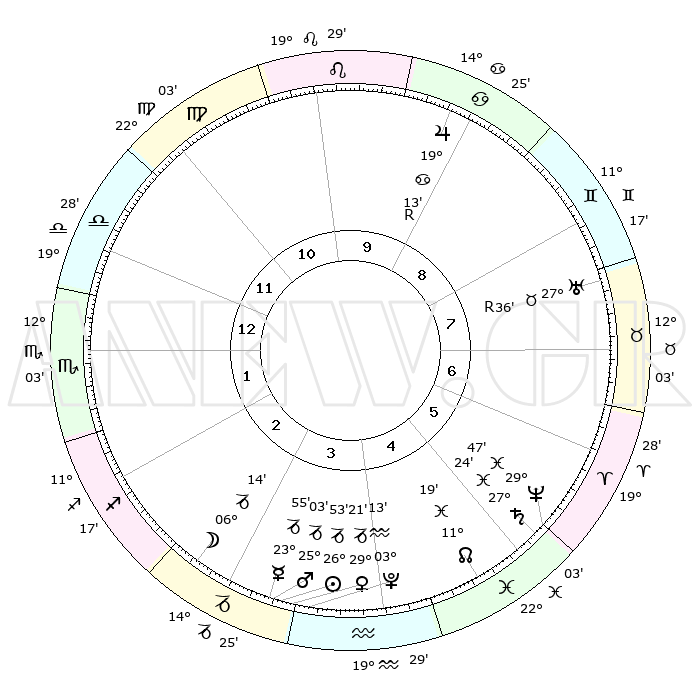 | | ΘΕΣΕΙΣ ΠΛΑΝΗΤΩΝ ΑΣΤΡΟΛΟΓΙΚΟΥ ΧΑΡΤΗ ΤΗΣ ΣΤΙΓΜΗΣ ΑΥΤΗΣ | | | | Πλανήτης | Ζώδιο | Μοίρες | Δεκαήμ. | Σε οίκο | Απόκλιση | | Ακμές των οίκων | | Ηλιος | Αιγόκερως | 26°49' | Τρίτο | 4 | 20 S 47 | | 1ος | 21°52' | Ζυγός | | Σελήνη | Αιγόκερως | 05°23' | Πρώτο | 3 | 27 S 57 | | 2ος | 19°48' | Σκορπιός | | Ερμής | Αιγόκερως | 23°48' | Τρίτο | 3 | 23 S 12 | | 3ος | 21°12' | Τοξότης | | Αφροδίτη | Αιγόκερως | 29°16' | Τρίτο | 4 | 21 S 19 | | 4ος | 24°54' | Αιγόκερως | | Αρης | Αιγόκερως | 24°60' | Τρίτο | 4 | 22 S 05 | | 5ος | 27°51' | Υδροχόος | | Δίας | Καρκίνος | 19°13'R | Δεύτερο | 9 | 22 N 20 | | 6ος | 27°10' | Ιχθείς | | Κρόνος | Ιχθείς | 27°24' | Τρίτο | 6 | 03 S 04 | | 7ος | 21°52' | Κριός | | Ουρανός | Ταύρος | 27°36'R | Τρίτο | 8 | 19 N 26 | | 8ος | 19°48' | Ταύρος | | Ποσειδώνας | Ιχθείς | 29°47' | Τρίτο | 6 | 01 S 18 | | 9ος | 21°12' | Δίδυμοι | | Πλούτωνας | Υδροχόος | 03°13' | Πρώτο | 4 | 23 S 07 | | 10ος | 24°54' | Καρκίνος | | Β. Δεσμός | Ιχθείς | 11°19' | Δεύτερο | 5 | 07 S 19 | | 11ος | 27°51' | Λέων | | Ωροσκόπος | Ζυγός | 21°52' | Τρίτο | | | 12ος | 27°10' | Παρθένος | | Μεσουράνημα | Καρκίνος | 24°54' | Τρίτο | | | |