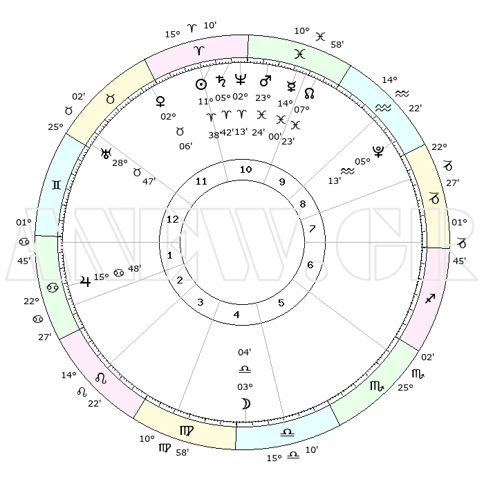 | | ΘΕΣΕΙΣ ΠΛΑΝΗΤΩΝ ΑΣΤΡΟΛΟΓΙΚΟΥ ΧΑΡΤΗ ΤΗΣ ΣΤΙΓΜΗΣ ΑΥΤΗΣ | | | | Πλανήτης | Ζώδιο | Μοίρες | Δεκαήμ. | Σε οίκο | Απόκλιση | | Ακμές των οίκων | | Ηλιος | Κριός | 11°31' | Δεύτερο | 12 | 04 N 33 | | 1ος | 14°45' | Ταύρος | | Σελήνη | Ζυγός | 01°32' | Πρώτο | 6 | 02 S 28 | | 2ος | 13°03' | Δίδυμοι | | Ερμής | Ιχθείς | 13°54' | Δεύτερο | 11 | 07 S 34 | | 3ος | 05°18' | Καρκίνος | | Αφροδίτη | Ταύρος | 01°57' | Πρώτο | 12 | 11 N 44 | | 4ος | 27°15' | Καρκίνος | | Αρης | Ιχθείς | 23°19' | Τρίτο | 11 | 03 S 37 | | 5ος | 23°22' | Λέων | | Δίας | Καρκίνος | 15°48' | Δεύτερο | 3 | 22 N 52 | | 6ος | 29°02' | Παρθένος | | Κρόνος | Κριός | 05°41' | Πρώτο | 12 | 00 N 18 | | 7ος | 14°45' | Σκορπιός | | Ουρανός | Ταύρος | 28°46' | Τρίτο | 1 | 19 N 43 | | 8ος | 13°03' | Τοξότης | | Ποσειδώνας | Κριός | 02°13' | Πρώτο | 12 | 00 S 19 | | 9ος | 05°18' | Αιγόκερως | | Πλούτωνας | Υδροχόος | 05°13' | Πρώτο | 10 | 22 S 47 | | 10ος | 27°15' | Αιγόκερως | | Β. Δεσμός | Ιχθείς | 07°23' | Πρώτο | 11 | 08 S 48 | | 11ος | 23°22' | Υδροχόος | | Ωροσκόπος | Ταύρος | 14°45' | Δεύτερο | | | 12ος | 29°02' | Ιχθείς | | Μεσουράνημα | Αιγόκερως | 27°15' | Τρίτο | | | |