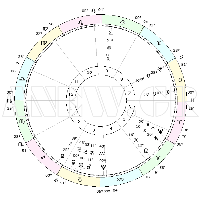 | | ΘΕΣΕΙΣ ΠΛΑΝΗΤΩΝ ΑΣΤΡΟΛΟΓΙΚΟΥ ΧΑΡΤΗ ΤΗΣ ΣΤΙΓΜΗΣ ΑΥΤΗΣ | | | | Πλανήτης | Ζώδιο | Μοίρες | Δεκαήμ. | Σε οίκο | Απόκλιση | | Ακμές των οίκων | | Ηλιος | Αιγόκερως | 08°28' | Πρώτο | 4 | 23 S 10 | | 1ος | 07°25' | Ζυγός | | Σελήνη | Ταύρος | 06°17' | Πρώτο | 8 | 17 N 32 | | 2ος | 04°31' | Σκορπιός | | Ερμής | Τοξότης | 25°31' | Τρίτο | 3 | 23 S 42 | | 3ος | 05°14' | Τοξότης | | Αφροδίτη | Αιγόκερως | 06°37' | Πρώτο | 3 | 23 S 42 | | 4ος | 08°21' | Αιγόκερως | | Αρης | Αιγόκερως | 11°07' | Δεύτερο | 4 | 23 S 51 | | 5ος | 11°17' | Υδροχόος | | Δίας | Καρκίνος | 21°37'R | Τρίτο | 10 | 21 N 56 | | 6ος | 11°25' | Ιχθείς | | Κρόνος | Ιχθείς | 26°10' | Τρίτο | 6 | 03 S 36 | | 7ος | 07°25' | Κριός | | Ουρανός | Ταύρος | 28°00'R | Τρίτο | 8 | 19 N 31 | | 8ος | 04°31' | Ταύρος | | Ποσειδώνας | Ιχθείς | 29°29' | Τρίτο | 6 | 01 S 26 | | 9ος | 05°14' | Δίδυμοι | | Πλούτωνας | Υδροχόος | 02°40' | Πρώτο | 4 | 23 S 14 | | 10ος | 08°21' | Καρκίνος | | Β. Δεσμός | Ιχθείς | 12°17' | Δεύτερο | 6 | 06 S 57 | | 11ος | 11°17' | Λέων | | Ωροσκόπος | Ζυγός | 07°25' | Πρώτο | | | 12ος | 11°25' | Παρθένος | | Μεσουράνημα | Καρκίνος | 08°21' | Πρώτο | | | |