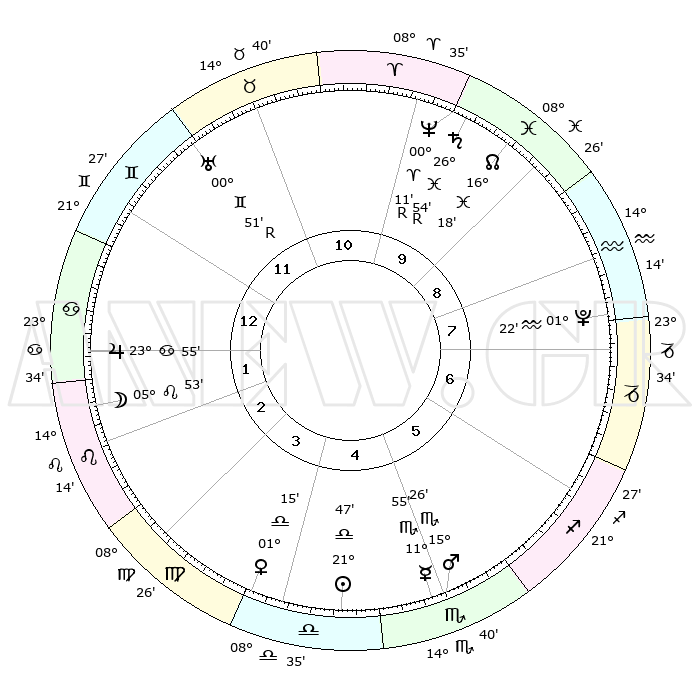 | ΘΕΣΕΙΣ ΠΛΑΝΗΤΩΝ ΑΣΤΡΟΛΟΓΙΚΟΥ ΧΑΡΤΗ ΤΗΣ ΣΤΙΓΜΗΣ ΑΥΤΗΣ | | Πλανήτης | Ζώδιο | Μοίρες | Δεκαήμ. | Σε οίκο | Απόκλιση | | Ακμές των οίκων | Ηλιος | Ζυγός | 21°37' | Τρίτο | 6 | 08 S 25 | | 1ος | 22°07' | Ταύρος | Σελήνη | Λέων | 03°34' | Πρώτο | 4 | 22 N 54 | | 2ος | 18°38' | Δίδυμοι | Ερμής | Σκορπιός | 11°40' | Δεύτερο | 6 | 16 S 57 | | 3ος | 10°25' | Καρκίνος | Αφροδίτη | Ζυγός | 01°02' | Πρώτο | 5 | 00 N 58 | | 4ος | 02°41' | Λέων | Αρης | Σκορπιός | 15°19' | Δεύτερο | 6 | 16 S 38 | | 5ος | 29°51' | Λέων | Δίας | Καρκίνος | 23°54' | Τρίτο | 3 | 21 N 22 | | 6ος | 06°57' | Ζυγός | Κρόνος | Ιχθείς | 26°54'R | Τρίτο | 11 | 03 S 32 | | 7ος | 22°07' | Σκορπιός | Ουρανός | Δίδυμοι | 00°52'R | Πρώτο | 1 | 20 N 07 | | 8ος | 18°38' | Τοξότης | Ποσειδώνας | Κριός | 00°11'R | Πρώτο | 11 | 01 S 11 | | 9ος | 10°25' | Αιγόκερως | Πλούτωνας | Υδροχόος | 01°22' | Πρώτο | 9 | 23 S 32 | | 10ος | 02°41' | Υδροχόος | Β. Δεσμός | Ιχθείς | 16°19' | Δεύτερο | 11 | 05 S 24 | | 11ος | 29°51' | Υδροχόος | Ωροσκόπος | Ταύρος | 22°07' | Τρίτο | | | 12ος | 06°57' | Κριός | Μεσουράνημα | Υδροχόος | 02°41' | Πρώτο | | | |