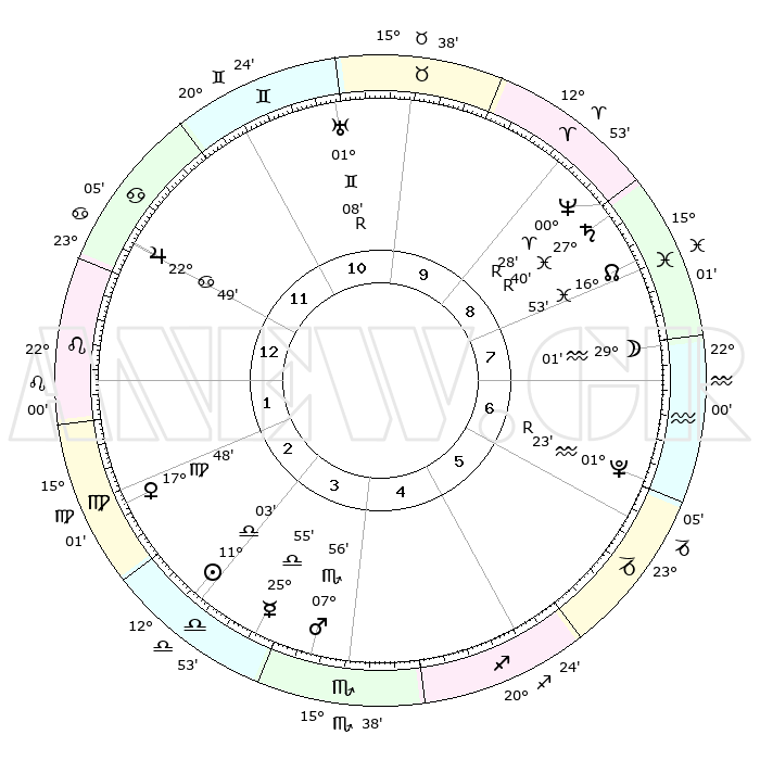 | ΘΕΣΕΙΣ ΠΛΑΝΗΤΩΝ ΑΣΤΡΟΛΟΓΙΚΟΥ ΧΑΡΤΗ ΤΗΣ ΣΤΙΓΜΗΣ ΑΥΤΗΣ | | Πλανήτης | Ζώδιο | Μοίρες | Δεκαήμ. | Σε οίκο | Απόκλιση | | Ακμές των οίκων | Ηλιος | Ζυγός | 10°58' | Δεύτερο | 3 | 04 S 20 | | 1ος | 00°40' | Λέων | Σελήνη | Υδροχόος | 28°01' | Τρίτο | 8 | 13 S 52 | | 2ος | 21°44' | Λέων | Ερμής | Ζυγός | 25°49' | Τρίτο | 4 | 10 S 24 | | 3ος | 16°53' | Παρθένος | Αφροδίτη | Παρθένος | 17°43' | Δεύτερο | 3 | 06 N 06 | | 4ος | 17°60' | Ζυγός | Αρης | Σκορπιός | 07°53' | Πρώτο | 4 | 14 S 14 | | 5ος | 24°01' | Σκορπιός | Δίας | Καρκίνος | 22°49' | Τρίτο | 12 | 21 N 32 | | 6ος | 29°37' | Τοξότης | Κρόνος | Ιχθείς | 27°40'R | Τρίτο | 9 | 03 S 14 | | 7ος | 00°40' | Υδροχόος | Ουρανός | Δίδυμοι | 01°09'R | Πρώτο | 11 | 20 N 11 | | 8ος | 21°44' | Υδροχόος | Ποσειδώνας | Κριός | 00°28'R | Πρώτο | 9 | 01 S 05 | | 9ος | 16°53' | Ιχθείς | Πλούτωνας | Υδροχόος | 01°23'R | Πρώτο | 7 | 23 S 32 | | 10ος | 17°60' | Κριός | Β. Δεσμός | Ιχθείς | 16°53' | Δεύτερο | 9 | 05 S 11 | | 11ος | 24°01' | Ταύρος | Ωροσκόπος | Λέων | 00°40' | Πρώτο | | | 12ος | 29°37' | Δίδυμοι | Μεσουράνημα | Κριός | 17°60' | Δεύτερο | | | |