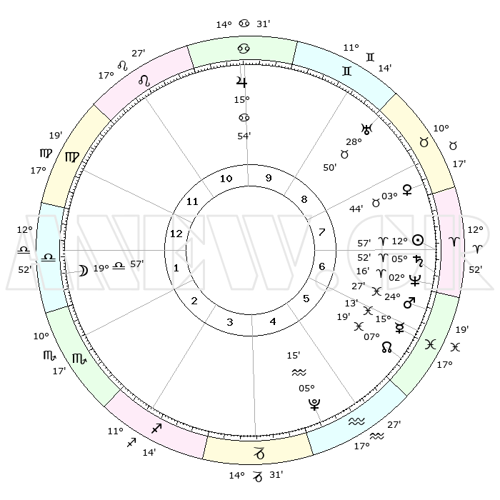 | | ΘΕΣΕΙΣ ΠΛΑΝΗΤΩΝ ΑΣΤΡΟΛΟΓΙΚΟΥ ΧΑΡΤΗ ΤΗΣ ΣΤΙΓΜΗΣ ΑΥΤΗΣ | | | | Πλανήτης | Ζώδιο | Μοίρες | Δεκαήμ. | Σε οίκο | Απόκλιση | | Ακμές των οίκων | | Ηλιος | Κριός | 12°53' | Δεύτερο | 7 | 05 N 05 | | 1ος | 22°36' | Παρθένος | | Σελήνη | Ζυγός | 19°06' | Δεύτερο | 2 | 10 S 35 | | 2ος | 18°37' | Ζυγός | | Ερμής | Ιχθείς | 15°09' | Δεύτερο | 6 | 07 S 17 | | 3ος | 18°44' | Σκορπιός | | Αφροδίτη | Ταύρος | 03°39' | Πρώτο | 8 | 12 N 23 | | 4ος | 21°40' | Τοξότης | | Αρης | Ιχθείς | 24°24' | Τρίτο | 7 | 03 S 11 | | 5ος | 24°47' | Αιγόκερως | | Δίας | Καρκίνος | 15°53' | Δεύτερο | 10 | 22 N 51 | | 6ος | 25°30' | Υδροχόος | | Κρόνος | Κριός | 05°52' | Πρώτο | 7 | 00 N 22 | | 7ος | 22°36' | Ιχθείς | | Ουρανός | Ταύρος | 28°50' | Τρίτο | 9 | 19 N 44 | | 8ος | 18°37' | Κριός | | Ποσειδώνας | Κριός | 02°16' | Πρώτο | 7 | 00 S 18 | | 9ος | 18°44' | Ταύρος | | Πλούτωνας | Υδροχόος | 05°15' | Πρώτο | 5 | 22 S 47 | | 10ος | 21°40' | Δίδυμοι | | Β. Δεσμός | Ιχθείς | 07°19' | Πρώτο | 6 | 08 S 49 | | 11ος | 24°47' | Καρκίνος | | Ωροσκόπος | Παρθένος | 22°36' | Τρίτο | | | 12ος | 25°30' | Λέων | | Μεσουράνημα | Δίδυμοι | 21°40' | Τρίτο | | | |