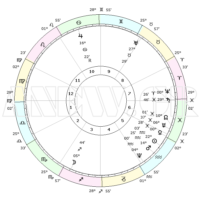 | | ΘΕΣΕΙΣ ΠΛΑΝΗΤΩΝ ΑΣΤΡΟΛΟΓΙΚΟΥ ΧΑΡΤΗ ΤΗΣ ΣΤΙΓΜΗΣ ΑΥΤΗΣ | | | | Πλανήτης | Ζώδιο | Μοίρες | Δεκαήμ. | Σε οίκο | Απόκλιση | | Ακμές των οίκων | | Ηλιος | Υδροχόος | 21°60' | Τρίτο | 6 | 14 S 10 | | 1ος | 13°30' | Παρθένος | | Σελήνη | Τοξότης | 05°06' | Πρώτο | 3 | 26 S 18 | | 2ος | 08°43' | Ζυγός | | Ερμής | Ιχθείς | 06°32' | Πρώτο | 6 | 09 S 50 | | 3ος | 08°23' | Σκορπιός | | Αφροδίτη | Ιχθείς | 00°24' | Πρώτο | 6 | 12 S 42 | | 4ος | 11°19' | Τοξότης | | Αρης | Υδροχόος | 14°22' | Δεύτερο | 5 | 17 S 32 | | 5ος | 14°45' | Αιγόκερως | | Δίας | Καρκίνος | 16°23'R | Δεύτερο | 11 | 22 N 45 | | 6ος | 15°52' | Υδροχόος | | Κρόνος | Ιχθείς | 29°46' | Τρίτο | 7 | 02 S 04 | | 7ος | 13°30' | Ιχθείς | | Ουρανός | Ταύρος | 27°29' | Τρίτο | 9 | 19 N 25 | | 8ος | 08°43' | Κριός | | Ποσειδώνας | Κριός | 00°26' | Πρώτο | 7 | 01 S 02 | | 9ος | 08°23' | Ταύρος | | Πλούτωνας | Υδροχόος | 04°00' | Πρώτο | 5 | 22 S 58 | | 10ος | 11°19' | Δίδυμοι | | Β. Δεσμός | Ιχθείς | 10°01' | Δεύτερο | 6 | 07 S 49 | | 11ος | 14°45' | Καρκίνος | | Ωροσκόπος | Παρθένος | 13°30' | Δεύτερο | | | 12ος | 15°52' | Λέων | | Μεσουράνημα | Δίδυμοι | 11°19' | Δεύτερο | | | |