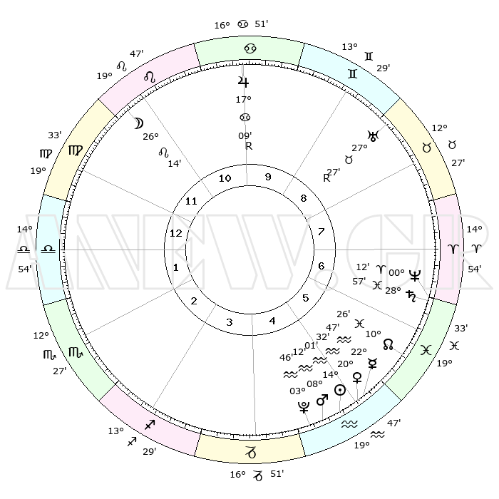 | | ΘΕΣΕΙΣ ΠΛΑΝΗΤΩΝ ΑΣΤΡΟΛΟΓΙΚΟΥ ΧΑΡΤΗ ΤΗΣ ΣΤΙΓΜΗΣ ΑΥΤΗΣ | | | | Πλανήτης | Ζώδιο | Μοίρες | Δεκαήμ. | Σε οίκο | Απόκλιση | | Ακμές των οίκων | | Ηλιος | Υδροχόος | 13°58' | Δεύτερο | 5 | 16 S 38 | | 1ος | 29°21' | Παρθένος | | Σελήνη | Λέων | 25°30' | Τρίτο | 11 | 14 N 11 | | 2ος | 25°54' | Ζυγός | | Ερμής | Υδροχόος | 22°42' | Τρίτο | 5 | 15 S 36 | | 3ος | 26°18' | Σκορπιός | | Αφροδίτη | Υδροχόος | 20°28' | Τρίτο | 5 | 15 S 59 | | 4ος | 29°17' | Τοξότης | | Αρης | Υδροχόος | 08°09' | Πρώτο | 5 | 19 S 14 | | 5ος | 02°16' | Υδροχόος | | Δίας | Καρκίνος | 17°09'R | Δεύτερο | 10 | 22 N 38 | | 6ος | 02°43' | Ιχθείς | | Κρόνος | Ιχθείς | 28°56' | Τρίτο | 6 | 02 S 25 | | 7ος | 29°21' | Ιχθείς | | Ουρανός | Ταύρος | 27°27'R | Τρίτο | 9 | 19 N 24 | | 8ος | 25°54' | Κριός | | Ποσειδώνας | Κριός | 00°12' | Πρώτο | 7 | 01 S 08 | | 9ος | 26°18' | Ταύρος | | Πλούτωνας | Υδροχόος | 03°45' | Πρώτο | 5 | 23 S 01 | | 10ος | 29°17' | Δίδυμοι | | Β. Δεσμός | Ιχθείς | 10°26' | Δεύτερο | 6 | 07 S 39 | | 11ος | 02°16' | Λέων | | Ωροσκόπος | Παρθένος | 29°21' | Τρίτο | | | 12ος | 02°43' | Παρθένος | | Μεσουράνημα | Δίδυμοι | 29°17' | Τρίτο | | | |