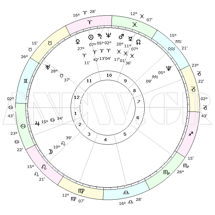 | | ΘΕΣΕΙΣ ΠΛΑΝΗΤΩΝ ΑΣΤΡΟΛΟΓΙΚΟΥ ΧΑΡΤΗ ΤΗΣ ΣΤΙΓΜΗΣ ΑΥΤΗΣ | | | | Πλανήτης | Ζώδιο | Μοίρες | Δεκαήμ. | Σε οίκο | Απόκλιση | | Ακμές των οίκων | | Ηλιος | Κριός | 07°38' | Πρώτο | 11 | 03 N 02 | | 1ος | 08°48' | Δίδυμοι | | Σελήνη | Λέων | 09°45' | Πρώτο | 3 | 20 N 15 | | 2ος | 01°59' | Καρκίνος | | Ερμής | Ιχθείς | 10°59' | Δεύτερο | 10 | 08 S 04 | | 3ος | 23°13' | Καρκίνος | | Αφροδίτη | Κριός | 27°06' | Τρίτο | 12 | 09 N 53 | | 4ος | 16°44' | Λέων | | Αρης | Ιχθείς | 20°14' | Τρίτο | 11 | 04 S 50 | | 5ος | 16°47' | Παρθένος | | Δίας | Καρκίνος | 15°34' | Δεύτερο | 2 | 22 N 54 | | 6ος | 26°24' | Ζυγός | | Κρόνος | Κριός | 05°12' | Πρώτο | 11 | 00 N 07 | | 7ος | 08°48' | Τοξότης | | Ουρανός | Ταύρος | 28°36' | Τρίτο | 12 | 19 N 41 | | 8ος | 01°59' | Αιγόκερως | | Ποσειδώνας | Κριός | 02°04' | Πρώτο | 11 | 00 S 23 | | 9ος | 23°13' | Αιγόκερως | | Πλούτωνας | Υδροχόος | 05°09' | Πρώτο | 9 | 22 S 48 | | 10ος | 16°44' | Υδροχόος | | Β. Δεσμός | Ιχθείς | 07°36' | Πρώτο | 10 | 08 S 43 | | 11ος | 16°47' | Ιχθείς | | Ωροσκόπος | Δίδυμοι | 08°48' | Πρώτο | | | 12ος | 26°24' | Κριός | | Μεσουράνημα | Υδροχόος | 16°44' | Δεύτερο | | | |