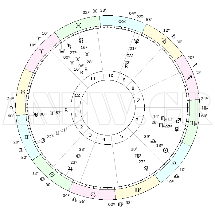 | ΘΕΣΕΙΣ ΠΛΑΝΗΤΩΝ ΑΣΤΡΟΛΟΓΙΚΟΥ ΧΑΡΤΗ ΤΗΣ ΣΤΙΓΜΗΣ ΑΥΤΗΣ | | Πλανήτης | Ζώδιο | Μοίρες | Δεκαήμ. | Σε οίκο | Απόκλιση | | Ακμές των οίκων | Ηλιος | Ζυγός | 18°28' | Δεύτερο | 8 | 07 S 14 | | 1ος | 15°27' | Υδροχόος | Σελήνη | Δίδυμοι | 19°31' | Δεύτερο | 4 | 28 N 13 | | 2ος | 01°10' | Κριός | Ερμής | Σκορπιός | 07°10' | Πρώτο | 9 | 15 S 11 | | 3ος | 06°48' | Ταύρος | Αφροδίτη | Παρθένος | 27°06' | Τρίτο | 7 | 02 N 30 | | 4ος | 02°53' | Δίδυμοι | Αρης | Σκορπιός | 13°07' | Δεύτερο | 9 | 15 S 57 | | 5ος | 24°50' | Δίδυμοι | Δίας | Καρκίνος | 23°37' | Τρίτο | 6 | 21 N 25 | | 6ος | 17°07' | Καρκίνος | Κρόνος | Ιχθείς | 27°07'R | Τρίτο | 1 | 03 S 27 | | 7ος | 15°27' | Λέων | Ουρανός | Δίδυμοι | 00°57'R | Πρώτο | 3 | 20 N 08 | | 8ος | 01°10' | Ζυγός | Ποσειδώνας | Κριός | 00°16'R | Πρώτο | 1 | 01 S 09 | | 9ος | 06°48' | Σκορπιός | Πλούτωνας | Υδροχόος | 01°22'R | Πρώτο | 12 | 23 S 32 | | 10ος | 02°53' | Τοξότης | Β. Δεσμός | Ιχθείς | 16°29' | Δεύτερο | 1 | 05 S 20 | | 11ος | 24°50' | Τοξότης | Ωροσκόπος | Υδροχόος | 15°27' | Δεύτερο | | | 12ος | 17°07' | Αιγόκερως | Μεσουράνημα | Τοξότης | 02°53' | Πρώτο | | | |