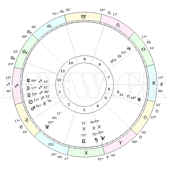 | | ΘΕΣΕΙΣ ΠΛΑΝΗΤΩΝ ΑΣΤΡΟΛΟΓΙΚΟΥ ΧΑΡΤΗ ΤΗΣ ΣΤΙΓΜΗΣ ΑΥΤΗΣ | | | | Πλανήτης | Ζώδιο | Μοίρες | Δεκαήμ. | Σε οίκο | Απόκλιση | | Ακμές των οίκων | | Ηλιος | Τοξότης | 27°10' | Τρίτο | 4 | 23 S 24 | | 1ος | 00°39' | Παρθένος | | Σελήνη | Τοξότης | 13°38' | Δεύτερο | 4 | 27 S 24 | | 2ος | 24°34' | Παρθένος | | Ερμής | Τοξότης | 09°13' | Πρώτο | 4 | 20 S 48 | | 3ος | 23°18' | Ζυγός | | Αφροδίτη | Τοξότης | 22°39' | Τρίτο | 4 | 23 S 13 | | 4ος | 26°13' | Σκορπιός | | Αρης | Αιγόκερως | 02°40' | Πρώτο | 5 | 24 S 12 | | 5ος | 00°22' | Αιγόκερως | | Δίας | Καρκίνος | 22°57'R | Τρίτο | 11 | 21 N 41 | | 6ος | 02°16' | Υδροχόος | | Κρόνος | Ιχθείς | 25°40' | Τρίτο | 8 | 03 S 50 | | 7ος | 00°39' | Ιχθείς | | Ουρανός | Ταύρος | 28°21'R | Τρίτο | 10 | 19 N 36 | | 8ος | 24°34' | Ιχθείς | | Ποσειδώνας | Ιχθείς | 29°24' | Τρίτο | 8 | 01 S 28 | | 9ος | 23°18' | Κριός | | Πλούτωνας | Υδροχόος | 02°21' | Πρώτο | 6 | 23 S 18 | | 10ος | 26°13' | Ταύρος | | Β. Δεσμός | Ιχθείς | 12°52' | Δεύτερο | 7 | 06 S 44 | | 11ος | 00°22' | Καρκίνος | | Ωροσκόπος | Παρθένος | 00°39' | Πρώτο | | | 12ος | 02°16' | Λέων | | Μεσουράνημα | Ταύρος | 26°13' | Τρίτο | | | |