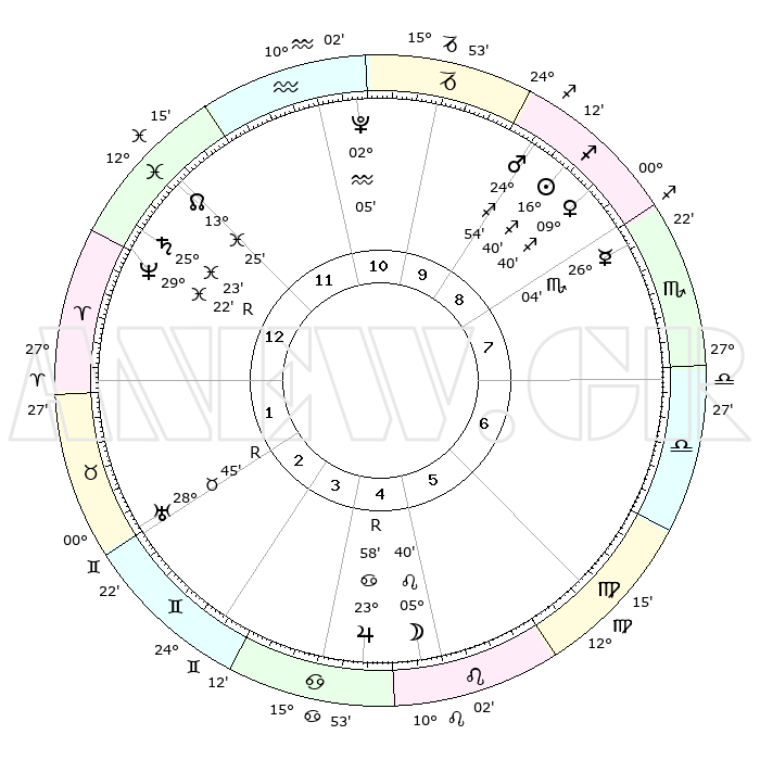 | | ΘΕΣΕΙΣ ΠΛΑΝΗΤΩΝ ΑΣΤΡΟΛΟΓΙΚΟΥ ΧΑΡΤΗ ΤΗΣ ΣΤΙΓΜΗΣ ΑΥΤΗΣ | | | | Πλανήτης | Ζώδιο | Μοίρες | Δεκαήμ. | Σε οίκο | Απόκλιση | | Ακμές των οίκων | | Ηλιος | Τοξότης | 16°37' | Δεύτερο | 9 | 22 S 46 | | 1ος | 00°42' | Κριός | | Σελήνη | Λέων | 05°00' | Πρώτο | 5 | 22 N 02 | | 2ος | 10°50' | Ταύρος | | Ερμής | Σκορπιός | 26°01' | Τρίτο | 8 | 17 S 03 | | 3ος | 08°07' | Δίδυμοι | | Αφροδίτη | Τοξότης | 09°36' | Πρώτο | 9 | 21 S 28 | | 4ος | 00°24' | Καρκίνος | | Αρης | Τοξότης | 24°52' | Τρίτο | 9 | 24 S 03 | | 5ος | 22°44' | Καρκίνος | | Δίας | Καρκίνος | 23°59'R | Τρίτο | 5 | 21 N 29 | | 6ος | 20°14' | Λέων | | Κρόνος | Ιχθείς | 25°23' | Τρίτο | 12 | 03 S 59 | | 7ος | 00°42' | Ζυγός | | Ουρανός | Ταύρος | 28°45'R | Τρίτο | 2 | 19 N 41 | | 8ος | 10°49' | Σκορπιός | | Ποσειδώνας | Ιχθείς | 29°22'R | Τρίτο | 12 | 01 S 29 | | 9ος | 08°07' | Τοξότης | | Πλούτωνας | Υδροχόος | 02°05' | Πρώτο | 11 | 23 S 22 | | 10ος | 00°24' | Αιγόκερως | | Β. Δεσμός | Ιχθείς | 13°25' | Δεύτερο | 12 | 06 S 31 | | 11ος | 22°44' | Αιγόκερως | | Ωροσκόπος | Κριός | 00°42' | Πρώτο | | | 12ος | 20°14' | Υδροχόος | | Μεσουράνημα | Αιγόκερως | 00°24' | Πρώτο | | | |