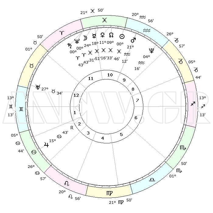 | | ΘΕΣΕΙΣ ΠΛΑΝΗΤΩΝ ΑΣΤΡΟΛΟΓΙΚΟΥ ΧΑΡΤΗ ΤΗΣ ΣΤΙΓΜΗΣ ΑΥΤΗΣ | | | | Πλανήτης | Ζώδιο | Μοίρες | Δεκαήμ. | Σε οίκο | Απόκλιση | | Ακμές των οίκων | | Ηλιος | Ιχθείς | 00°42' | Πρώτο | 11 | 11 S 13 | | 1ος | 14°20' | Ταύρος | | Σελήνη | Ιχθείς | 23°36' | Τρίτο | 11 | 01 S 18 | | 2ος | 12°44' | Δίδυμοι | | Ερμής | Ιχθείς | 18°47' | Δεύτερο | 11 | 03 S 26 | | 3ος | 05°02' | Καρκίνος | | Αφροδίτη | Ιχθείς | 11°11' | Δεύτερο | 11 | 08 S 43 | | 4ος | 26°58' | Καρκίνος | | Αρης | Υδροχόος | 21°09' | Τρίτο | 10 | 15 S 28 | | 5ος | 23°02' | Λέων | | Δίας | Καρκίνος | 15°43'R | Δεύτερο | 3 | 22 N 50 | | 6ος | 28°37' | Παρθένος | | Κρόνος | Κριός | 00°43' | Πρώτο | 12 | 01 S 41 | | 7ος | 14°20' | Σκορπιός | | Ουρανός | Ταύρος | 27°34' | Τρίτο | 1 | 19 N 26 | | 8ος | 12°44' | Τοξότης | | Ποσειδώνας | Κριός | 00°43' | Πρώτο | 12 | 00 S 55 | | 9ος | 05°02' | Αιγόκερως | | Πλούτωνας | Υδροχόος | 04°16' | Πρώτο | 10 | 22 S 55 | | 10ος | 26°58' | Αιγόκερως | | Β. Δεσμός | Ιχθείς | 09°33' | Πρώτο | 11 | 07 S 59 | | 11ος | 23°02' | Υδροχόος | | Ωροσκόπος | Ταύρος | 14°20' | Δεύτερο | | | 12ος | 28°37' | Ιχθείς | | Μεσουράνημα | Αιγόκερως | 26°58' | Τρίτο | | | |