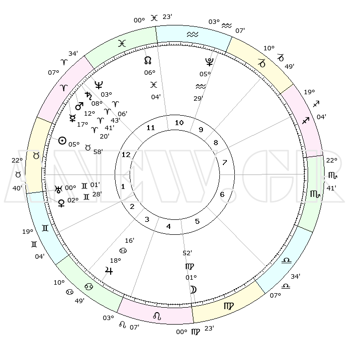 | | ΘΕΣΕΙΣ ΠΛΑΝΗΤΩΝ ΑΣΤΡΟΛΟΓΙΚΟΥ ΧΑΡΤΗ ΤΗΣ ΣΤΙΓΜΗΣ ΑΥΤΗΣ | | | | Πλανήτης | Ζώδιο | Μοίρες | Δεκαήμ. | Σε οίκο | Απόκλιση | | Ακμές των οίκων | | Ηλιος | Ταύρος | 05°55' | Πρώτο | 1 | 13 N 29 | | 1ος | 21°29' | Κριός | | Σελήνη | Παρθένος | 01°04' | Πρώτο | 5 | 11 N 37 | | 2ος | 26°04' | Ταύρος | | Ερμής | Κριός | 17°14' | Δεύτερο | 12 | 04 N 35 | | 3ος | 20°34' | Δίδυμοι | | Αφροδίτη | Δίδυμοι | 02°23' | Πρώτο | 2 | 21 N 18 | | 4ος | 12°17' | Καρκίνος | | Αρης | Κριός | 12°38' | Δεύτερο | 12 | 04 N 09 | | 5ος | 05°55' | Λέων | | Δίας | Καρκίνος | 18°16' | Δεύτερο | 4 | 22 N 34 | | 6ος | 06°59' | Παρθένος | | Κρόνος | Κριός | 08°42' | Πρώτο | 12 | 01 N 28 | | 7ος | 21°29' | Ζυγός | | Ουρανός | Δίδυμοι | 00°01' | Πρώτο | 2 | 19 N 59 | | 8ος | 26°04' | Σκορπιός | | Ποσειδώνας | Κριός | 03°06' | Πρώτο | 12 | 00 N 02 | | 9ος | 20°34' | Τοξότης | | Πλούτωνας | Υδροχόος | 05°29' | Πρώτο | 10 | 22 S 48 | | 10ος | 12°17' | Αιγόκερως | | Β. Δεσμός | Ιχθείς | 06°04' | Πρώτο | 11 | 09 S 17 | | 11ος | 05°55' | Υδροχόος | | Ωροσκόπος | Κριός | 21°29' | Τρίτο | | | 12ος | 06°59' | Ιχθείς | | Μεσουράνημα | Αιγόκερως | 12°17' | Δεύτερο | | | |