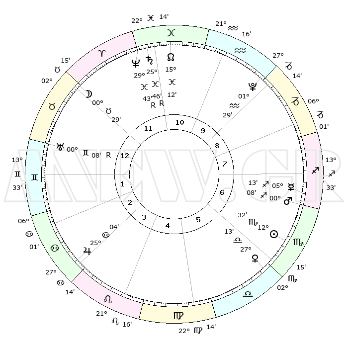 |  | ΘΕΣΕΙΣ ΠΛΑΝΗΤΩΝ ΑΣΤΡΟΛΟΓΙΚΟΥ ΧΑΡΤΗ ΤΗΣ ΣΤΙΓΜΗΣ ΑΥΤΗΣ |  |   |  | Πλανήτης | Ζώδιο | Μοίρες | Δεκαήμ. | Σε οίκο | Απόκλιση |   | Ακμές των οίκων |  | Ηλιος | Σκορπιός | 12°22' | Δεύτερο | 8 | 15 S 33 |   | 1ος | 14°34' | Ιχθείς |  | Σελήνη | Κριός | 27°50' | Τρίτο | 1 | 13 N 49 |   | 2ος | 28°07' | Κριός |  | Ερμής | Τοξότης | 05°07' | Πρώτο | 9 | 23 S 56 |   | 3ος | 28°05' | Ταύρος |  | Αφροδίτη | Ζυγός | 26°60' | Τρίτο | 7 | 09 S 04 |   | 4ος | 21°15' | Δίδυμοι |  | Αρης | Τοξότης | 00°00' | Πρώτο | 9 | 20 S 34 |   | 5ος | 13°04' | Καρκίνος |  | Δίας | Καρκίνος | 25°04' | Τρίτο | 5 | 21 N 12 |   | 6ος | 08°18' | Λέων |  | Κρόνος | Ιχθείς | 25°46'R | Τρίτο | 1 | 03 S 56 |   | 7ος | 14°34' | Παρθένος |  | Ουρανός | Δίδυμοι | 00°08'R | Πρώτο | 3 | 19 N 58 |   | 8ος | 28°07' | Ζυγός |  | Ποσειδώνας | Ιχθείς | 29°43'R | Τρίτο | 1 | 01 S 22 |   | 9ος | 28°05' | Σκορπιός |  | Πλούτωνας | Υδροχόος | 01°29' | Πρώτο | 11 | 23 S 30 |   | 10ος | 21°15' | Τοξότης |  | Β. Δεσμός | Ιχθείς | 15°13' | Δεύτερο | 1 | 05 S 50 |   | 11ος | 13°04' | Αιγόκερως |  | Ωροσκόπος | Ιχθείς | 14°34' | Δεύτερο |   |   | 12ος | 08°18' | Υδροχόος |  | Μεσουράνημα | Τοξότης | 21°15' | Τρίτο |   |   |   |