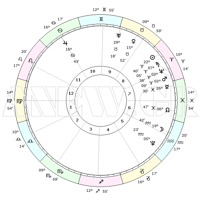 | | ΘΕΣΕΙΣ ΠΛΑΝΗΤΩΝ ΑΣΤΡΟΛΟΓΙΚΟΥ ΧΑΡΤΗ ΤΗΣ ΣΤΙΓΜΗΣ ΑΥΤΗΣ | | | | Πλανήτης | Ζώδιο | Μοίρες | Δεκαήμ. | Σε οίκο | Απόκλιση | | Ακμές των οίκων | | Ηλιος | Κριός | 22°37' | Τρίτο | 9 | 08 N 48 | | 1ος | 28°39' | Λέων | | Σελήνη | Υδροχόος | 18°59' | Δεύτερο | 6 | 16 S 44 | | 2ος | 22°22' | Παρθένος | | Ερμής | Ιχθείς | 26°26' | Τρίτο | 8 | 03 S 42 | | 3ος | 20°55' | Ζυγός | | Αφροδίτη | Ταύρος | 15°48' | Δεύτερο | 9 | 16 N 37 | | 4ος | 23°49' | Σκορπιός | | Αρης | Κριός | 02°07' | Πρώτο | 8 | 00 S 04 | | 5ος | 28°06' | Τοξότης | | Δίας | Καρκίνος | 16°43' | Δεύτερο | 11 | 22 N 46 | | 6ος | 00°10' | Υδροχόος | | Κρόνος | Κριός | 07°05' | Πρώτο | 8 | 00 N 51 | | 7ος | 28°39' | Υδροχόος | | Ουρανός | Ταύρος | 29°18' | Τρίτο | 10 | 19 N 50 | | 8ος | 22°22' | Ιχθείς | | Ποσειδώνας | Κριός | 02°38' | Πρώτο | 8 | 00 S 09 | | 9ος | 20°55' | Κριός | | Πλούτωνας | Υδροχόος | 05°22' | Πρώτο | 6 | 22 S 47 | | 10ος | 23°49' | Ταύρος | | Β. Δεσμός | Ιχθείς | 06°48' | Πρώτο | 7 | 09 S 01 | | 11ος | 28°06' | Δίδυμοι | | Ωροσκόπος | Λέων | 28°39' | Τρίτο | | | 12ος | 00°10' | Λέων | | Μεσουράνημα | Ταύρος | 23°49' | Τρίτο | | | |