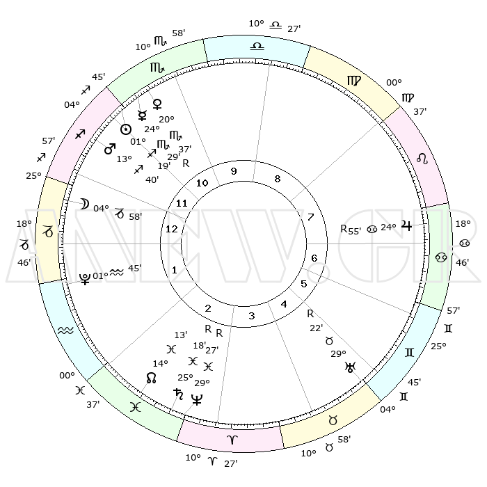 | | ΘΕΣΕΙΣ ΠΛΑΝΗΤΩΝ ΑΣΤΡΟΛΟΓΙΚΟΥ ΧΑΡΤΗ ΤΗΣ ΣΤΙΓΜΗΣ ΑΥΤΗΣ | | | | Πλανήτης | Ζώδιο | Μοίρες | Δεκαήμ. | Σε οίκο | Απόκλιση | | Ακμές των οίκων | | Ηλιος | Τοξότης | 01°15' | Πρώτο | 11 | 20 S 24 | | 1ος | 24°35' | Τοξότης | | Σελήνη | Αιγόκερως | 04°08' | Πρώτο | 1 | 28 S 05 | | 2ος | 00°24' | Υδροχόος | | Ερμής | Σκορπιός | 24°34'R | Τρίτο | 11 | 17 S 30 | | 3ος | 09°54' | Ιχθείς | | Αφροδίτη | Σκορπιός | 20°32' | Τρίτο | 11 | 16 S 57 | | 4ος | 14°38' | Κριός | | Αρης | Τοξότης | 13°37' | Δεύτερο | 12 | 23 S 01 | | 5ος | 11°50' | Ταύρος | | Δίας | Καρκίνος | 24°56'R | Τρίτο | 7 | 21 N 17 | | 6ος | 04°03' | Δίδυμοι | | Κρόνος | Ιχθείς | 25°18'R | Τρίτο | 3 | 04 S 04 | | 7ος | 24°35' | Δίδυμοι | | Ουρανός | Ταύρος | 29°22'R | Τρίτο | 5 | 19 N 48 | | 8ος | 00°24' | Λέων | | Ποσειδώνας | Ιχθείς | 29°27'R | Τρίτο | 3 | 01 S 28 | | 9ος | 09°54' | Παρθένος | | Πλούτωνας | Υδροχόος | 01°45' | Πρώτο | 2 | 23 S 26 | | 10ος | 14°38' | Ζυγός | | Β. Δεσμός | Ιχθείς | 14°13' | Δεύτερο | 3 | 06 S 13 | | 11ος | 11°50' | Σκορπιός | | Ωροσκόπος | Τοξότης | 24°35' | Τρίτο | | | 12ος | 04°03' | Τοξότης | | Μεσουράνημα | Ζυγός | 14°38' | Δεύτερο | | | |