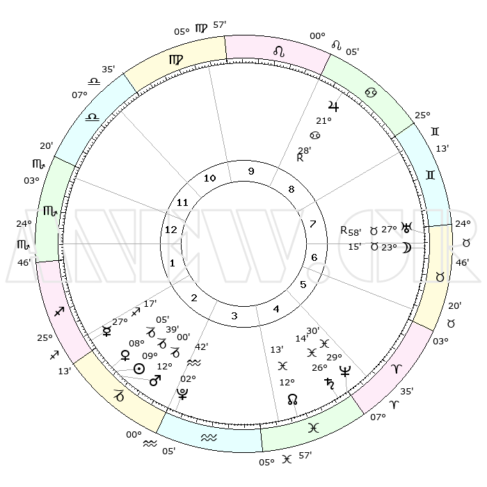 | | ΘΕΣΕΙΣ ΠΛΑΝΗΤΩΝ ΑΣΤΡΟΛΟΓΙΚΟΥ ΧΑΡΤΗ ΤΗΣ ΣΤΙΓΜΗΣ ΑΥΤΗΣ | | | | Πλανήτης | Ζώδιο | Μοίρες | Δεκαήμ. | Σε οίκο | Απόκλιση | | Ακμές των οίκων | | Ηλιος | Αιγόκερως | 09°34' | Πρώτο | 3 | 23 S 05 | | 1ος | 01°25' | Σκορπιός | | Σελήνη | Ταύρος | 22°03' | Τρίτο | 7 | 22 N 54 | | 2ος | 29°55' | Σκορπιός | | Ερμής | Τοξότης | 27°10' | Τρίτο | 2 | 23 S 52 | | 3ος | 01°59' | Αιγόκερως | | Αφροδίτη | Αιγόκερως | 07°59' | Πρώτο | 3 | 23 S 40 | | 4ος | 06°16' | Υδροχόος | | Αρης | Αιγόκερως | 11°57' | Δεύτερο | 3 | 23 S 47 | | 5ος | 09°10' | Ιχθείς | | Δίας | Καρκίνος | 21°29'R | Τρίτο | 9 | 21 N 57 | | 6ος | 07°43' | Κριός | | Κρόνος | Ιχθείς | 26°14' | Τρίτο | 5 | 03 S 35 | | 7ος | 01°25' | Ταύρος | | Ουρανός | Ταύρος | 27°58'R | Τρίτο | 7 | 19 N 31 | | 8ος | 29°55' | Ταύρος | | Ποσειδώνας | Ιχθείς | 29°30' | Τρίτο | 5 | 01 S 25 | | 9ος | 01°59' | Καρκίνος | | Πλούτωνας | Υδροχόος | 02°42' | Πρώτο | 3 | 23 S 14 | | 10ος | 06°16' | Λέων | | Β. Δεσμός | Ιχθείς | 12°13' | Δεύτερο | 5 | 06 S 58 | | 11ος | 09°10' | Παρθένος | | Ωροσκόπος | Σκορπιός | 01°25' | Πρώτο | | | 12ος | 07°43' | Ζυγός | | Μεσουράνημα | Λέων | 06°16' | Πρώτο | | | |