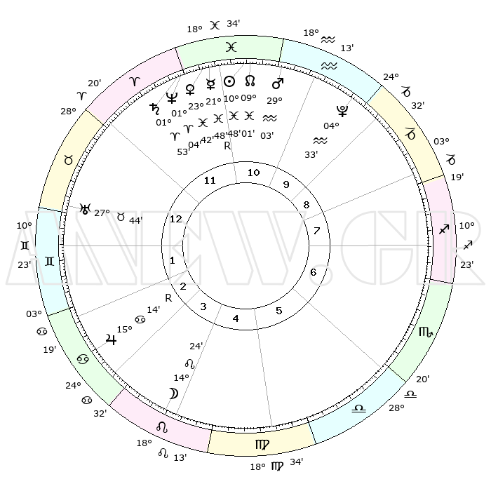| | ΘΕΣΕΙΣ ΠΛΑΝΗΤΩΝ ΑΣΤΡΟΛΟΓΙΚΟΥ ΧΑΡΤΗ ΤΗΣ ΣΤΙΓΜΗΣ ΑΥΤΗΣ | | | | Πλανήτης | Ζώδιο | Μοίρες | Δεκαήμ. | Σε οίκο | Απόκλιση | | Ακμές των οίκων | | Ηλιος | Ιχθείς | 10°44' | Δεύτερο | 11 | 07 S 32 | | 1ος | 15°07' | Ταύρος | | Σελήνη | Λέων | 13°36' | Δεύτερο | 4 | 18 N 55 | | 2ος | 13°20' | Δίδυμοι | | Ερμής | Ιχθείς | 21°50'R | Τρίτο | 11 | 00 S 10 | | 3ος | 05°33' | Καρκίνος | | Αφροδίτη | Ιχθείς | 23°38' | Τρίτο | 11 | 03 S 46 | | 4ος | 27°31' | Καρκίνος | | Αρης | Υδροχόος | 29°01' | Τρίτο | 11 | 12 S 50 | | 5ος | 23°41' | Λέων | | Δίας | Καρκίνος | 15°15'R | Δεύτερο | 3 | 22 N 54 | | 6ος | 29°26' | Παρθένος | | Κρόνος | Κριός | 01°53' | Πρώτο | 12 | 01 S 13 | | 7ος | 15°07' | Σκορπιός | | Ουρανός | Ταύρος | 27°44' | Τρίτο | 1 | 19 N 29 | | 8ος | 13°20' | Τοξότης | | Ποσειδώνας | Κριός | 01°04' | Πρώτο | 12 | 00 S 47 | | 9ος | 05°33' | Αιγόκερως | | Πλούτωνας | Υδροχόος | 04°33' | Πρώτο | 10 | 22 S 52 | | 10ος | 27°31' | Αιγόκερως | | Β. Δεσμός | Ιχθείς | 09°02' | Πρώτο | 11 | 08 S 11 | | 11ος | 23°41' | Υδροχόος | | Ωροσκόπος | Ταύρος | 15°07' | Δεύτερο | | | 12ος | 29°26' | Ιχθείς | | Μεσουράνημα | Αιγόκερως | 27°31' | Τρίτο | | | |